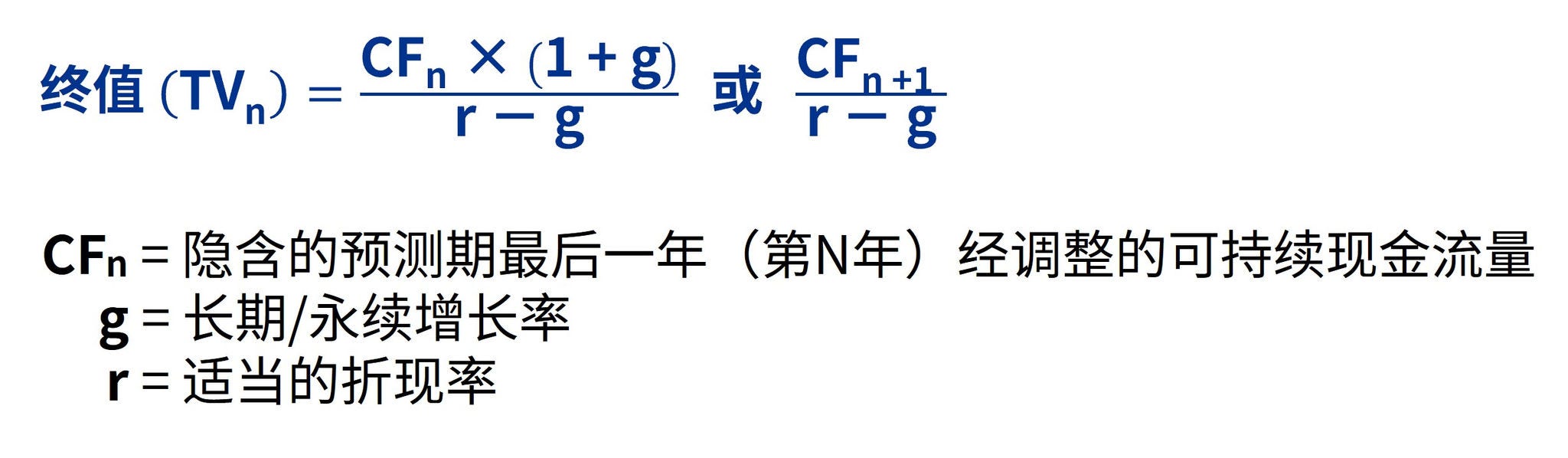 - 为反映稳定状态下的现金流量,可能需要对预测期最后一年的现金流量水平(戈登增长模型公式中的CFn(见下文))进行调整。