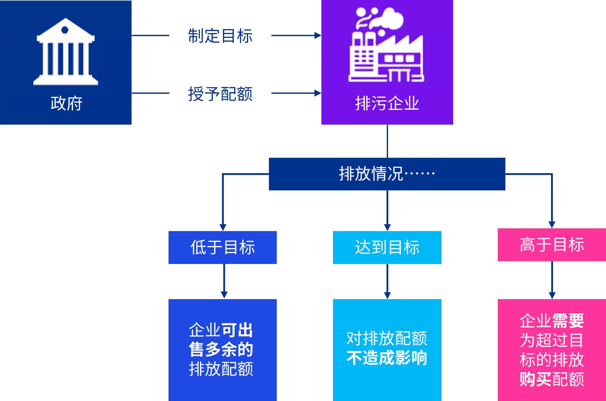 某些国家/地区实行“总量控制与交易”(cap-and-trade)机制。在这种机制下,企业获准在政府设定的特定排放限额内排放污染物,其排放量将在指定的期间内进行测量(合规期)。对于在允许范围内的排放量,政府通常会授予企业相应数量的排放配额。在合规期结束后,企业需要缴纳数量与该期间排放量相匹配的排放配额。企业可以与其他方交易排放配额,以确保其有数量足够与排放量相匹配的配额。
