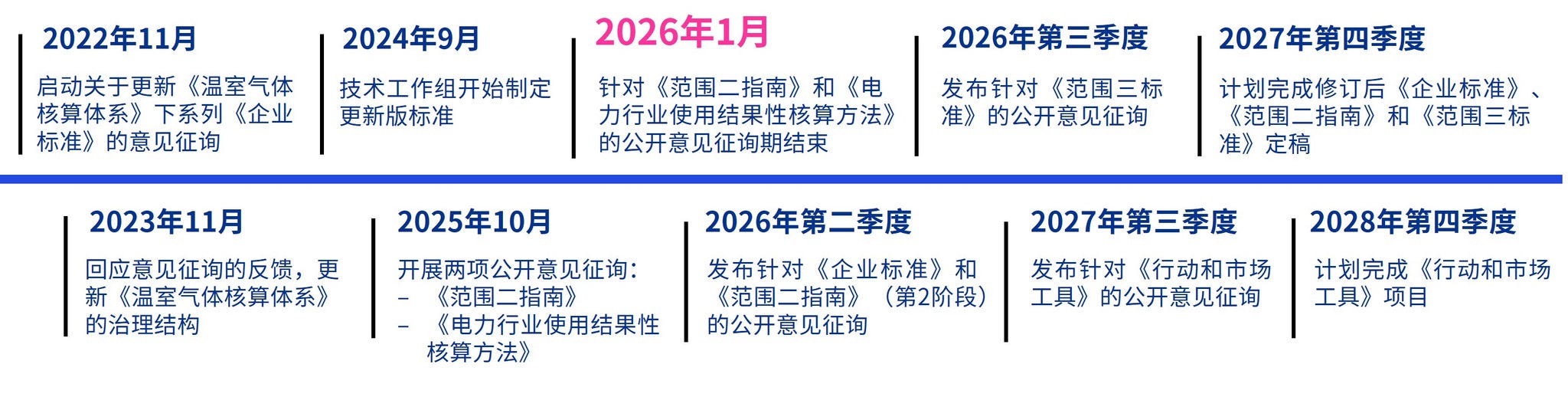 《温室气体核算体系》正在审议征询中收到的反馈意见。后续将陆续展开更多征询,包括针对范围二排放报告进一步提案。《温室气体核算体系》计划在2027年至2028年敲定新标准。