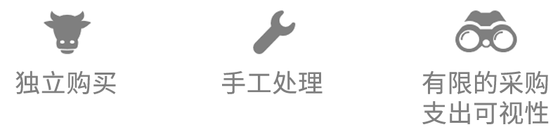 - 低效与复杂的采购至付款流程导致大量的特例购买与独立购买行为。