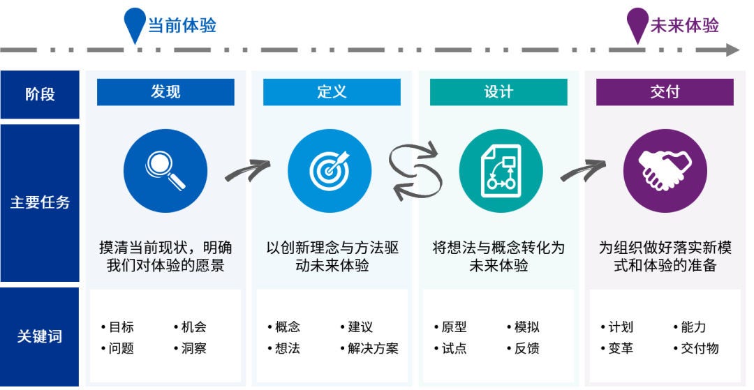 根据毕马威的经验,改进顾客体验(CX)需要经过“发现、定义、设计、交付“四个阶段: