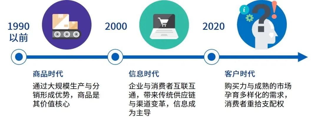 如果说90年代以前是生产和销售驱动的商品时代,21世纪初是互联网与信息技术推动的信息时代,那么伴随着21世纪第二个十年的到来,我们也全面进入了数字化驱动的客户时代。