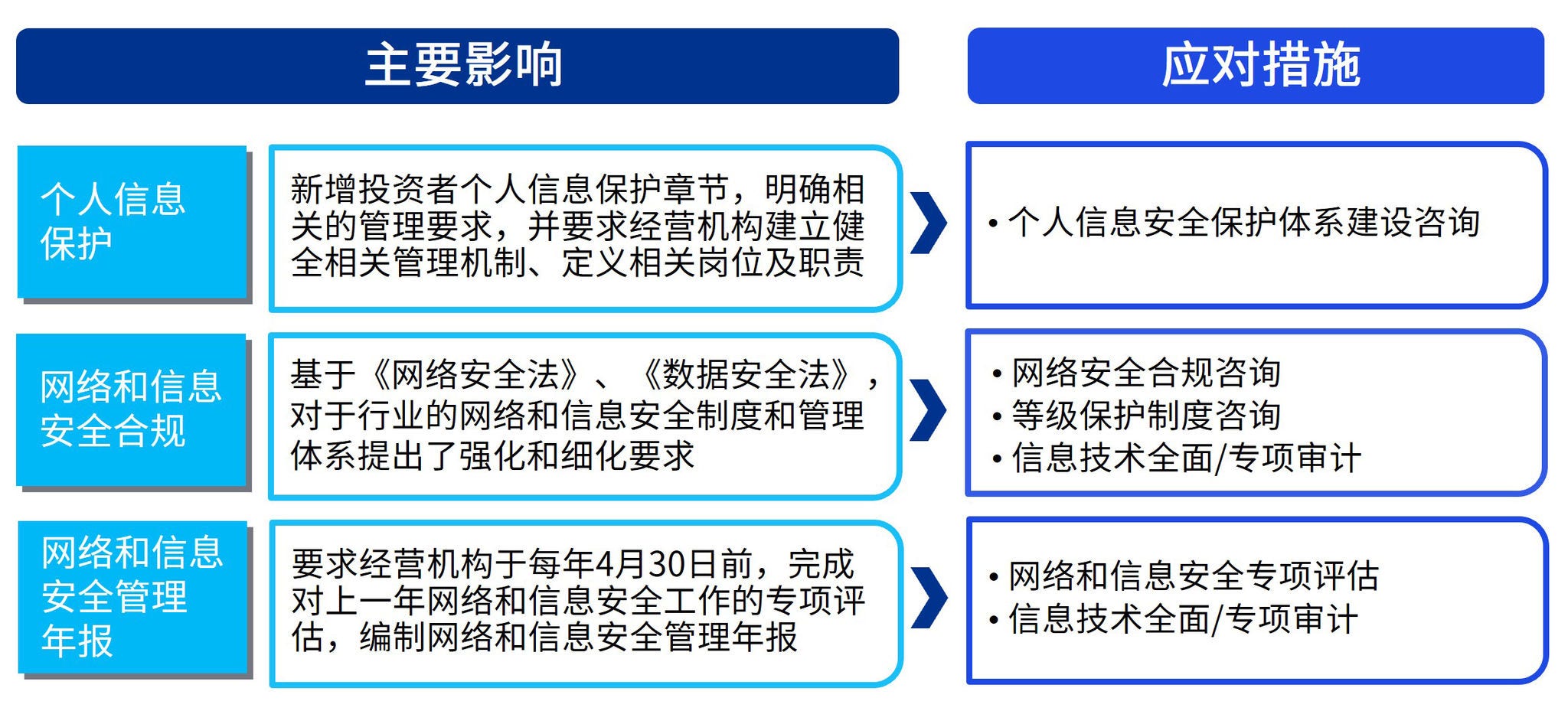 网络和信息安全管理年报 | 第五十九条 核心机构和经营机构应当于每年4月30日前,完成对上一年网络和信息安全工作的专项评估,编制网络和信息安全管理年报,报送中国证监会及其派出机构,年报内容包括但不限于网络和信息安全治理情况、人员情况、投入情况、风险情况、处置情况和下一年度工作计划等。…… | 《证券基金经营机构信息技术管理办法》: 第五十三条 证券基金经营机构应当在报送年度报告的同时报送年度信息技术管理专项报告,说明报告期内信息技术治理、信息技术合规与风险管理、信息技术安全管理、信息技术审计等执行本办法规定的情况。…… | 在证监会要求的信息科技管理专项报告等其他年度信息科技类报告基础之上,新办法新增了《网络和信息安全管理年报》相关要求,并明确了年报内容和报送期限。 |