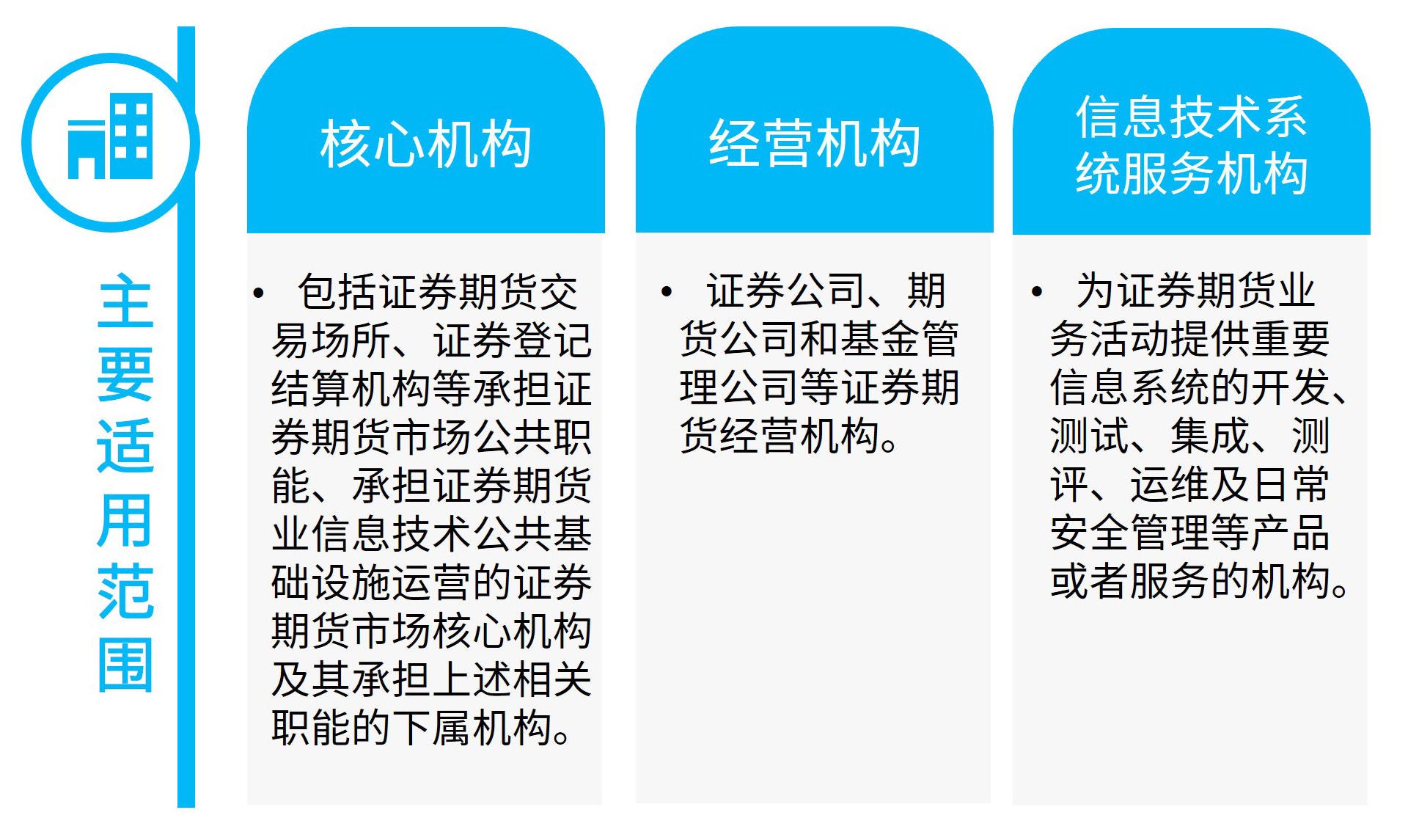 知识产权 | 第二十八条 核心机构和经营机构应当按照知识产权相关法律法规,制定知识产权保护策略和制度,不侵犯他人的知识产权,并采取有效措施保护本机构自主知识产权。 | 《证券期货业信息安全保障管理办法》: 第三十七条 核心机构和经营机构在采购软硬件产品或者技术服务时,应当与供应商签订合同和保密协议,并在合同和保密协议中明确约定信息安全和保密的权利和义务。…… | 考虑到证券期货业内信息系统建设任务明显增加,为了提升自主研发和安全可控能力,新办法提出了建立知识产权保护相关方面制度的要求。 |