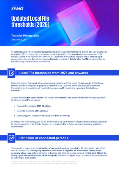 In December 2025, the House of Representatives approved amendments to the Income Tax Law of 2002 (as amended) (“ITL”), forming part of a broader tax reform initiative. The amendments were published in the Official Gazette of the Republic of Cyprus on 31 December 2025 and are effective from 1 January 2026. Among other changes, the reform introduced important updates to Article 33 of the ITL, impacting Cyprus transfer pricing documentation requirements.