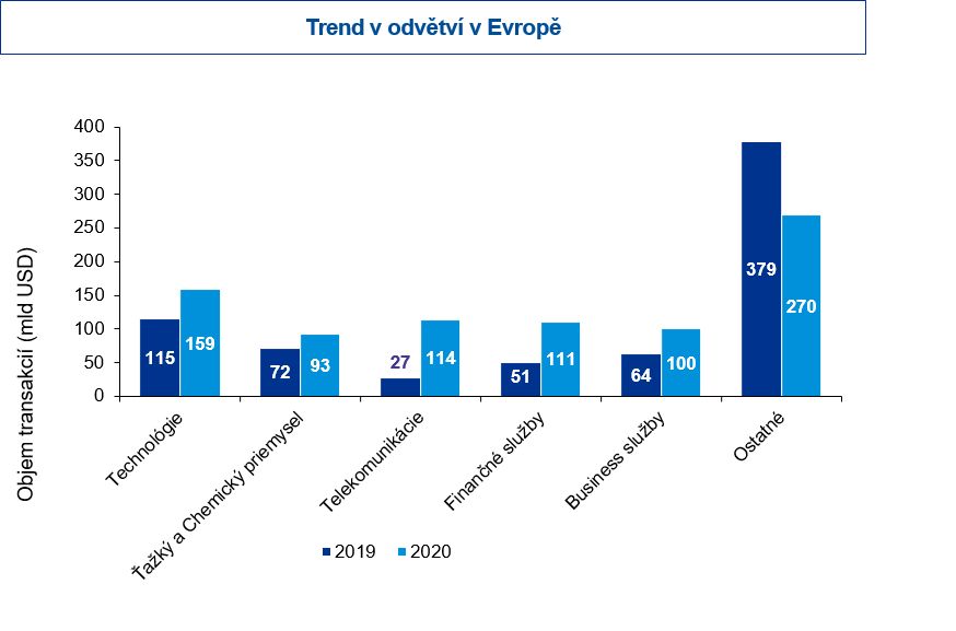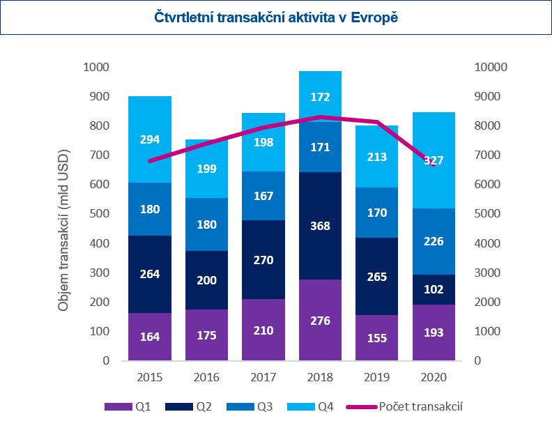 - Objem transakcí v roce 2020 rostl především díky druhé polovině roku, kdy v Evropě dosáhl hodnoty 552 miliard USD. Oproti H1 2020 vzrostl o téměř 90 %.