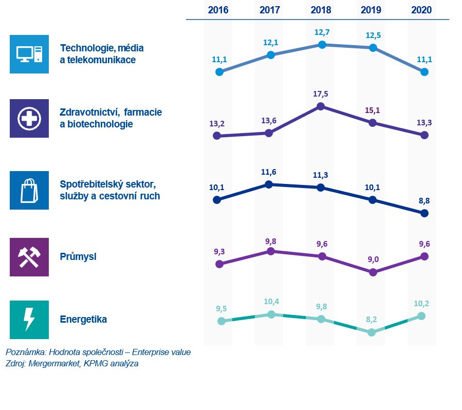 Přístup investorů k ocenění společností pandemie příliš neovlivnila. Současnou situaci investoři vnímají jako mimořádnou s minimálním vlivem na hodnotu společností. Následkem je pokles násobků v dynamicky rostoucích odvětvích, a naopak růst v krizí zasažených odvětvích. Podle dat a zkušeností KPMG se transakční násobky u společností podnikajících v regionu CEE, respektive v České a Slovenské republice, mohou v závislosti na odvětví, regionu a specifikách cílové společnosti pohybovat na nižší úrovni, než udávají celoevropská čísla uvedená dále.