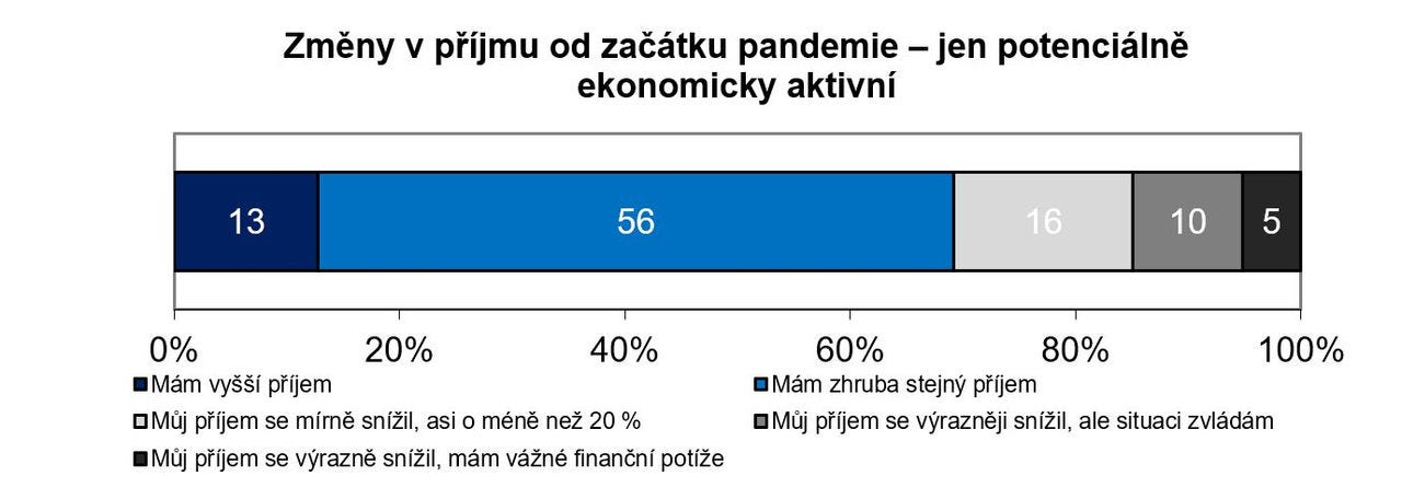 Stále je ovšem patrné, že v některých – zejména nízkopříjmových – skupinách ekonomické obtíže přetrvávají. 15 % ekonomicky aktivních zaznamenalo výrazné snížení příjmu, zároveň ale u přibližně stejné části (13 %) se příjem zvýšil. Zvýšení příjmu je naopak typické pro vysokopříjmové domácnosti (příjem více než 40 tis. čistého / měsíc).
