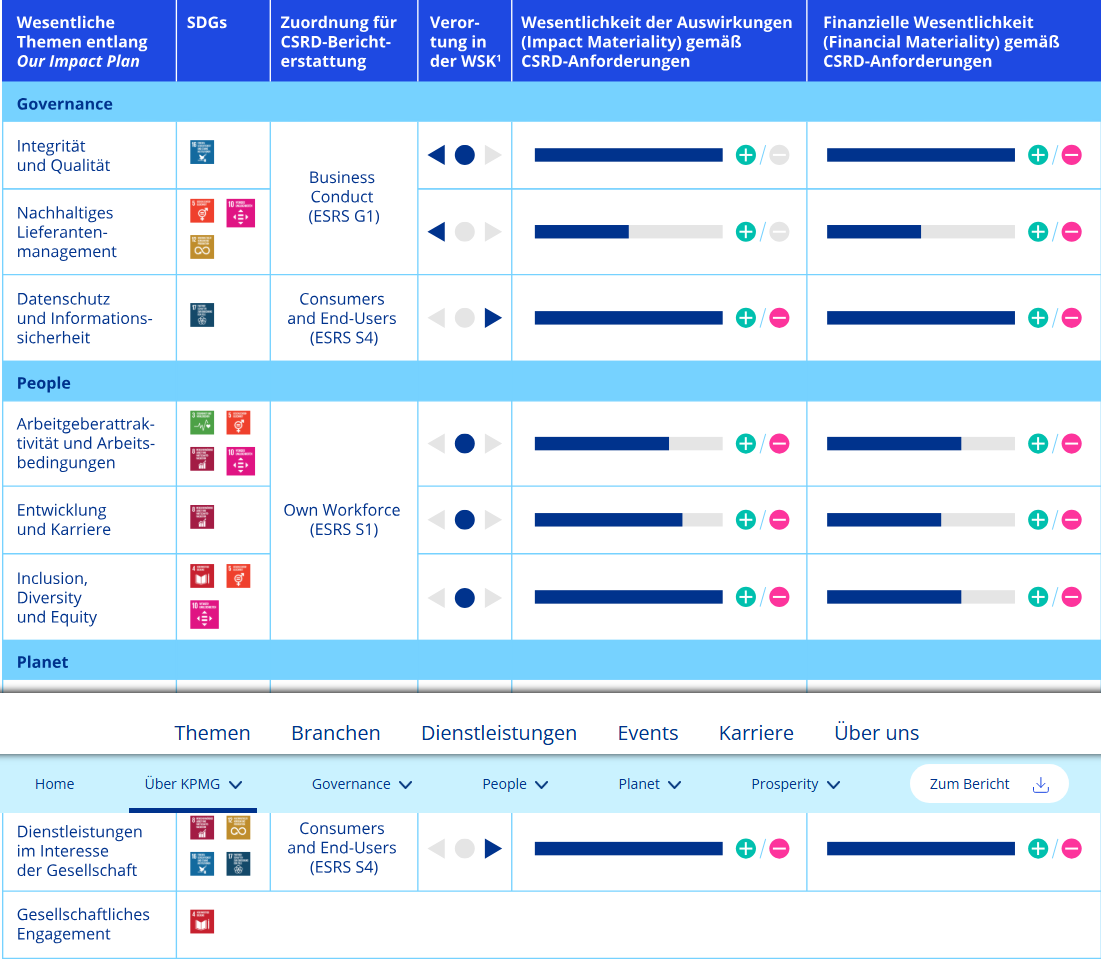As part of the global KPMG sustainability programme Our Impact Plan, we have identified material topics in the areas of governance, people, planet and prosperity. We focus on these priorities and implement measures, the progress of which we report on in the Our Impact Report. This is how we demonstrate our contribution to sustainable development.