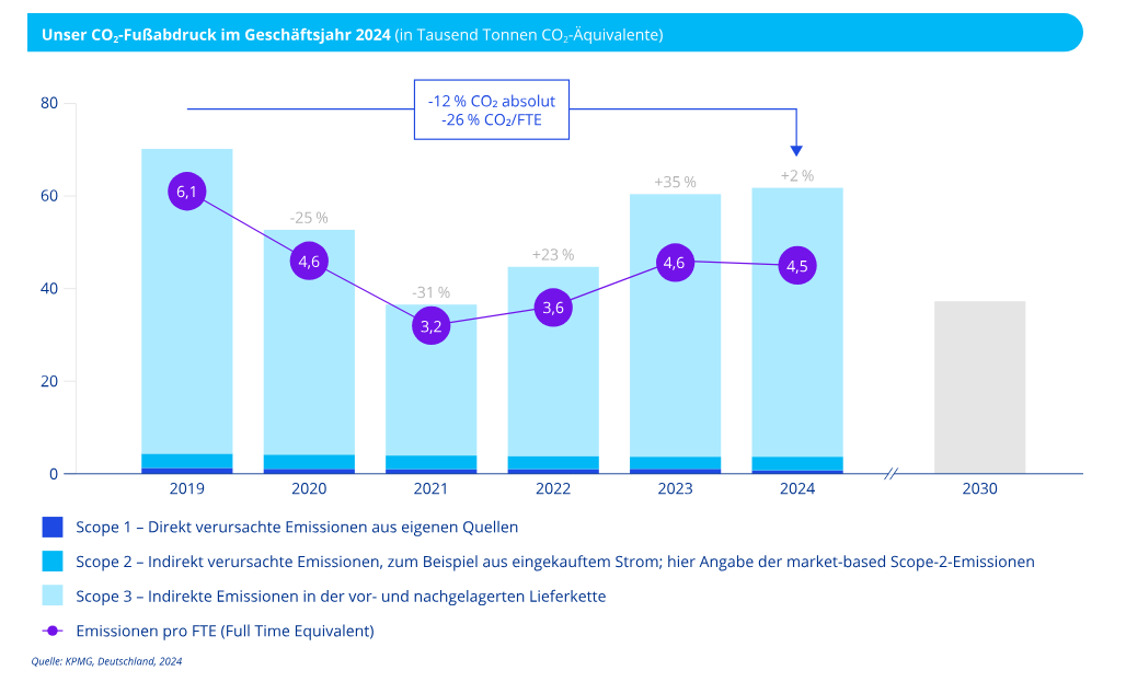 We determine our carbon footprint in line with our sustainability goals and the SBTi guidelines, taking into account all material Scope 3 emissions. This includes relevant upstream emissions from our value chain, including greenhouse gas emissions from our supply chain and the commuting behaviour of our employees. KPMG transmits the corresponding emissions data annually to KPMG International, which integrates it into the global reporting of the KPMG organisation to the SBTi.