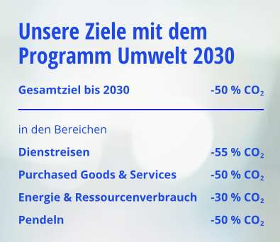 With our national environmental programme Environment 2030, we also want to meet our commitment in Germany to halve greenhouse gas emissions by 2030. The programme focuses on specific measures in the areas of mobility (business travel), sustainable supplier management, energy and resource consumption and commuting.