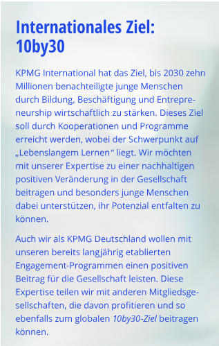 Our social commitment centres on the topics of "equal opportunities and high-quality education" and "lifelong learning". As KPMG, we have an interest in educating the next generation, but we also have expertise and extensive knowledge that our employees can pass on to society. We support this commitment with various programmes that offer our colleagues the opportunity to get involved and make a valuable contribution - in line with our value "For Better. We do what really matters." The interests and requirements of our employees always play an important role in this. In times of skills shortages and the war for talent, corporate engagement is an important factor in attracting and retaining employees, especially for large companies, as younger generations in particular attach great importance to this. We offer our employees various engagement opportunities with a focus on Competencies-based volunteering. We are continuously developing these in line with social trends.