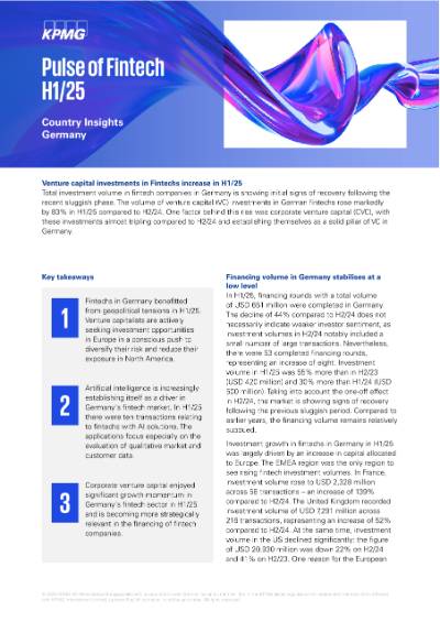 After a difficult year in 2024, the fintech market in Germany showed clear signs of recovery in the first half of 2025. Venture capital investments increased by 83 per cent compared to the previous six months. Corporate venture capital, i.e. investments by companies in start-ups, is developing particularly dynamically: with a volume of USD 451 million, it has almost tripled.