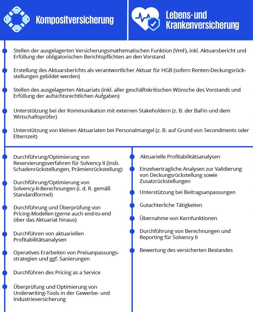 Die Auslagerung von aktuariellen Dienstleistungen ist gerade vor dem Hintergrund sich wandelnder regulatorischer Anforderungen, unsicheren Märkten und stetigem technologischen Fortschritt eine ernstzunehmende Alternative gegenüber dem Aufbau eines eigenen Aktuariats. Die hierfür nötige Bindung von Kompetenzen, oder auch ein Abzug dieser aus anderen Bereichen, ist häufig für kleinere oder neue Versicherer schwierig zu ermöglichen, wenn gleichzeitig das Kerngeschäft weiterlaufen soll.