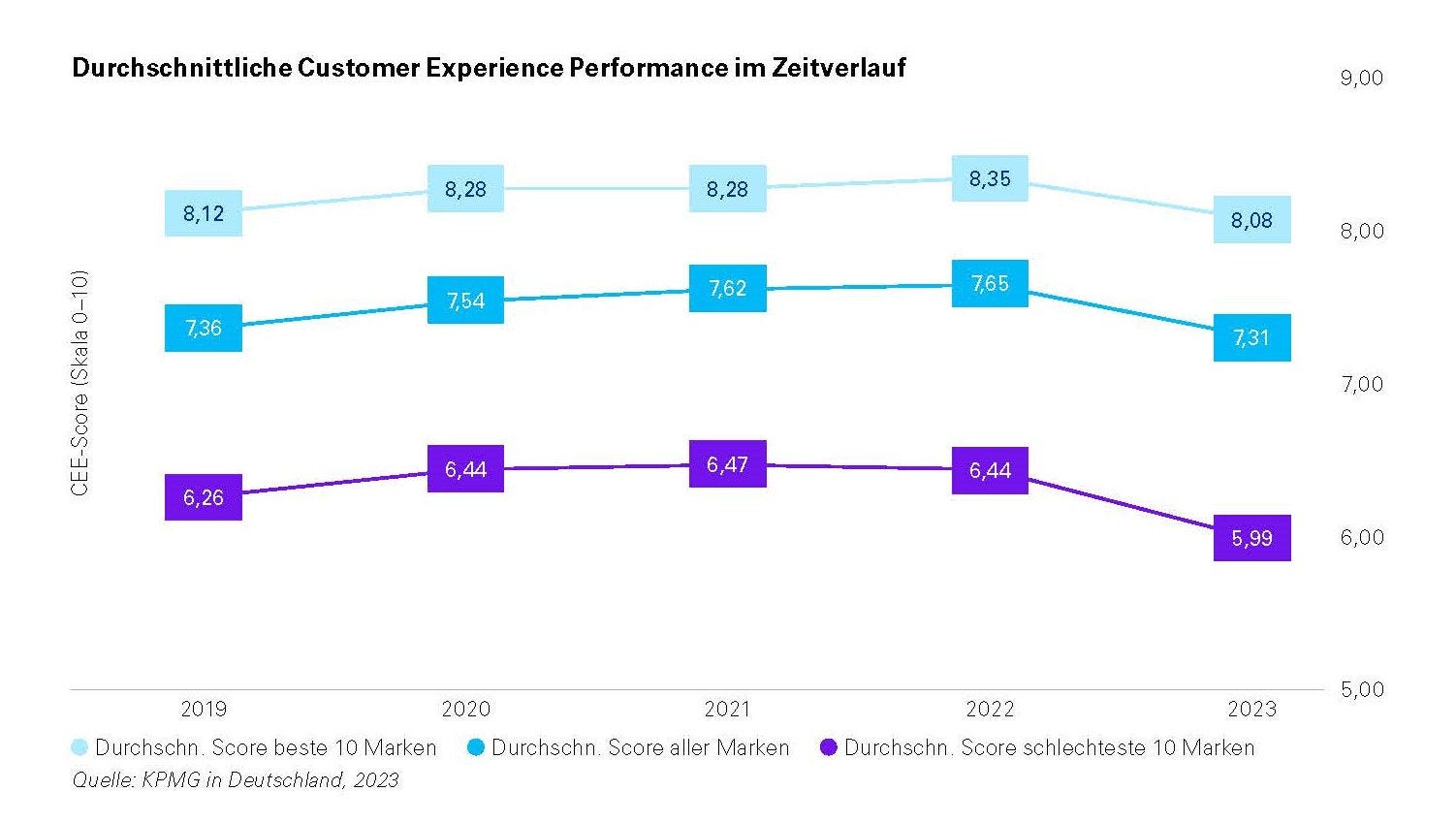 Herausragende Kundenerfahrungen sind für Unternehmen ein unerlässlicher Wettbewerbsfaktor. Da sich die Ansprüche der Kundschaft aber genauso wie das Marktumfeld schneller als früher verändern, ist das Management der Customer Experience sehr komplex. In unserer Studie zur Customer Experience Excellence (CEE) untersuchen wir seit 2019 jährlich, welche Unternehmen aus Konsumentensicht erfolgreich sind und wo Nachholbedarf besteht. 2023 gibt es eine Besonderheit: Erstmals wird die Customer Experience in Deutschland branchenübergreifend schlechter wahrgenommen.