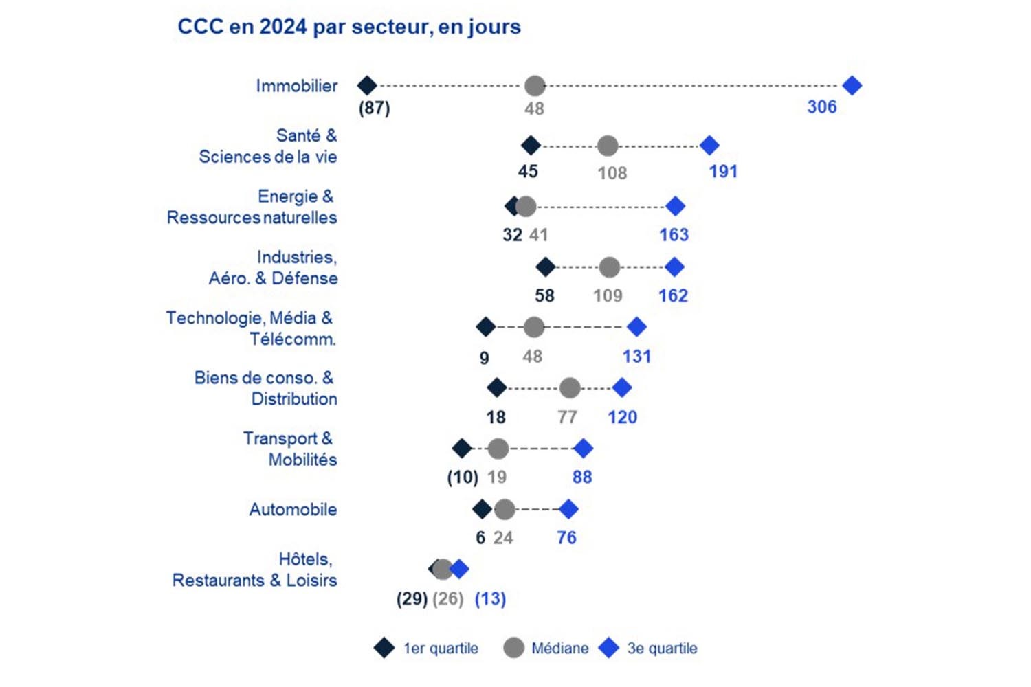 Graphique listant le CCC 2024 en jours pour dix secteurs, avec trois valeurs par secteur : 1er quartile, médiane et 3ᵉ quartile.
