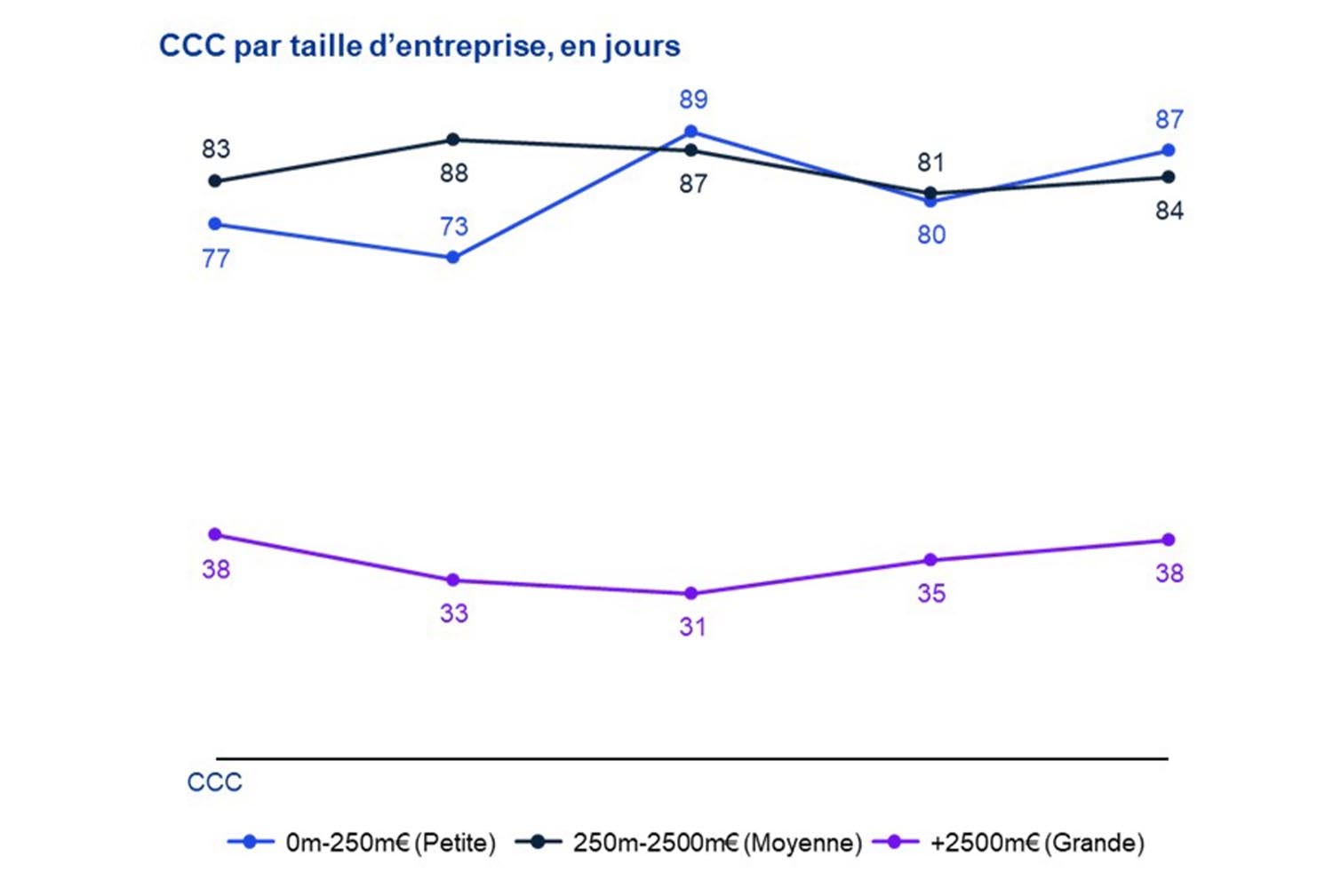Graphique en courbes présentant le CCC en jours selon la taille d’entreprise : petites (0–250 M€), moyennes (250–2500 M€) et grandes (+2500 M€).