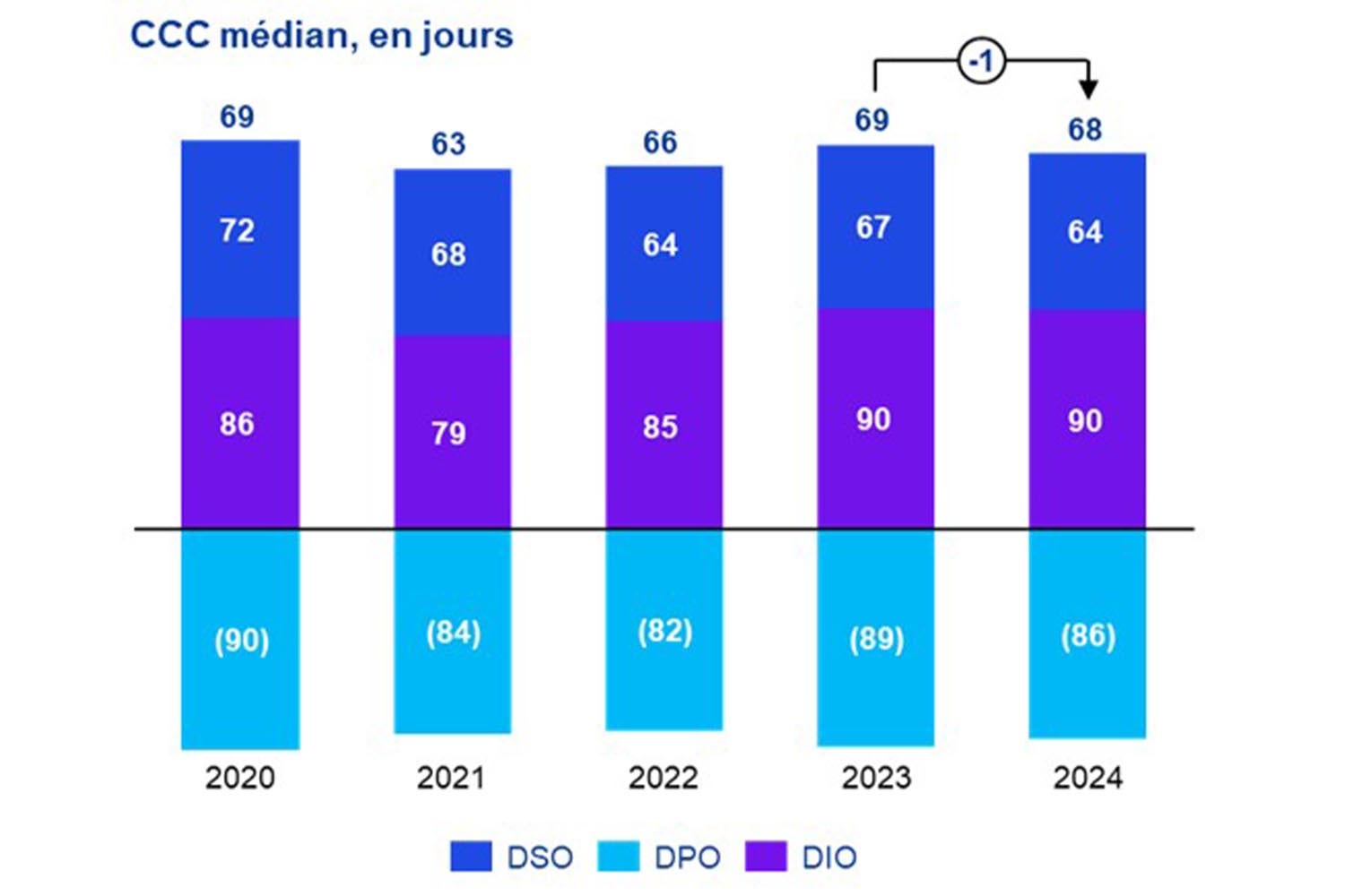 Chaque barre détaille trois composantes : DSO, DPO et DIO. Pour 2024 : DSO 64 jours, DIO 90 jours et DPO (–86) jours. Les valeurs des trois composantes varient légèrement d’une année à l’autre.