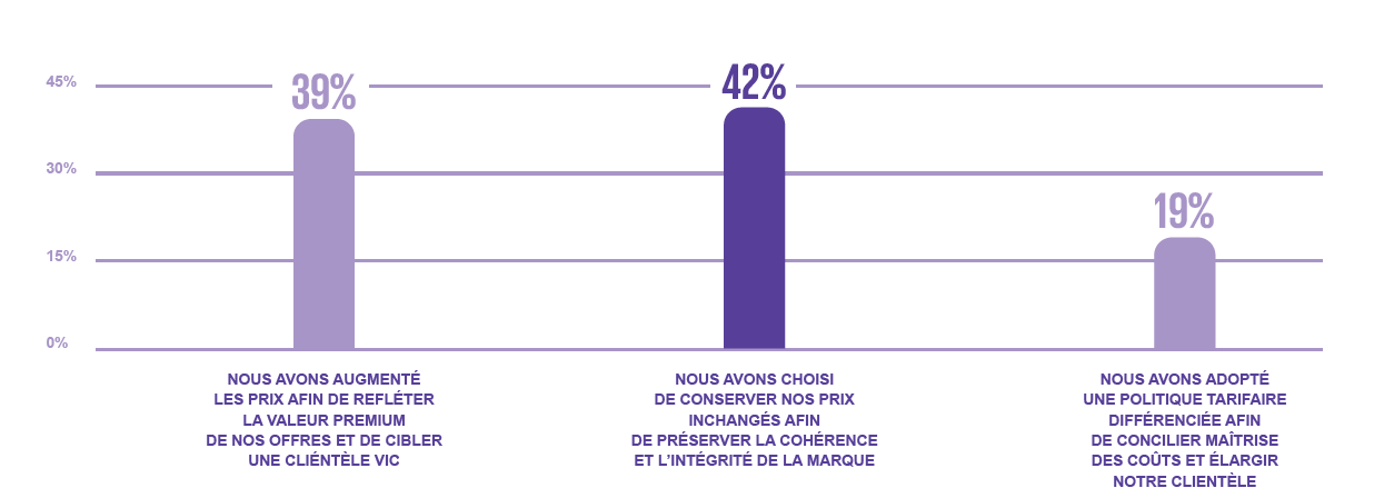Cette mutation profonde du secteur du luxe révèle un marché de plus en plus polarisé : les Very Important Customers (VIC), qui ne représentent que 2% de la clientèle, génèrent près de 40% du chiffre d'affaires. Notre étude, menée auprès de 180 professionnels du luxe, montre que 53% des marques privilégient désormais le renforcement de la fidélisation à travers des expériences client personnalisées, intégrant davantage de marketing digital et l’usage stratégique des données, tandis que 31% ciblent spécifiquement une clientèle premium moins sensible aux fluctuations économiques.