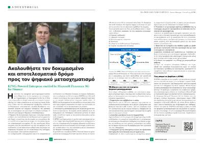 Η πλατφόρμα Microsoft Dynamics 365 είναι ένα σύγχρονο σύστημα διαχείρισης ενδοεταιρικών πόρων (ERP) και παράλληλα συνεργάζεται με όλη την λειτουργικότητα που προσφέρει η Microsoft (office365, AI, robots, Power platform, κλπ.), ώστε να διευκολύνει και να εξυπηρετεί την «καθημερινότητα» των χρηστών. Η KPMG υποστηρίζει πλήρως το ταξίδι του ψηφιακού μετασχηματισμού και σας βοηθάει να εκμεταλλευτείτε στο έπακρο την νέα πλατφόρμα Microsoft Dynamics 365 αναβαθμίζοντας/βελτιώνοντας παράλληλα το λειτουργικό σας μοντέλο