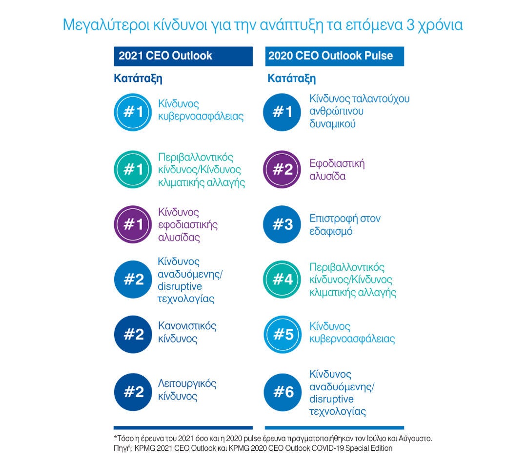 Καθώς οι CEOs προσπαθούν να δώσουν ώθηση στην ανάπτυξη, έχουν επίσης το σημαντικό έργο να καθοδηγήσουν τις εταιρείες σε μια εποχή μεγάλης αβεβαιότητας, όπου οι υποθέσεις και οι προβλέψεις υπόκεινται σε συνεχείς αλλαγές. Aυτό σημαίνει ότι λίγα πράγματα είναι σίγουρα και κανένας κίνδυνος δεν αναδύθηκε στην κορυφή. Υπάρχει τριπλή απειλή για την ανάπτυξη: η αλυσίδα εφοδιασμού, η κυβερνοασφάλεια και η κλιματική αλλαγή. Πολύ κοντά ακολουθούν η disruptive τεχνολογία, ο ρυθμιστικός και ο λειτουργικός κίνδυνος.