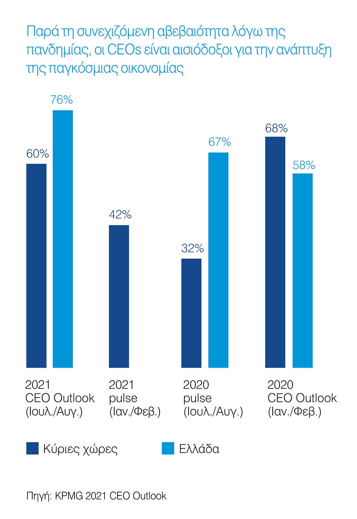 Παρά τη συνεχιζόμενη αβεβαιότητα γύρω από την πανδημία, σύμφωνα με την έρευνα, οι απόψεις και η εμπιστοσύνη των CEOs έχουν μετατοπιστεί. Οι CEOs είναι πιο αισιόδοξοι για την ανάπτυξη: για πρώτη φορά μετά τον Ιανουάριο/Φεβρουάριο του 2020, πριν την πανδημία, περισσότεροι από τους μισούς (60%) μεταξύ των παγκόσμιων CEOs  και σε ακόμη υψηλότερο ποσοστό (76%) των Ελλήνων CEOs να εκφράζουν βεβαιότητα για την προοπτική ανάπτυξης της παγκόσμιας οικονομίας τα επόμενα 3 χρόνια.