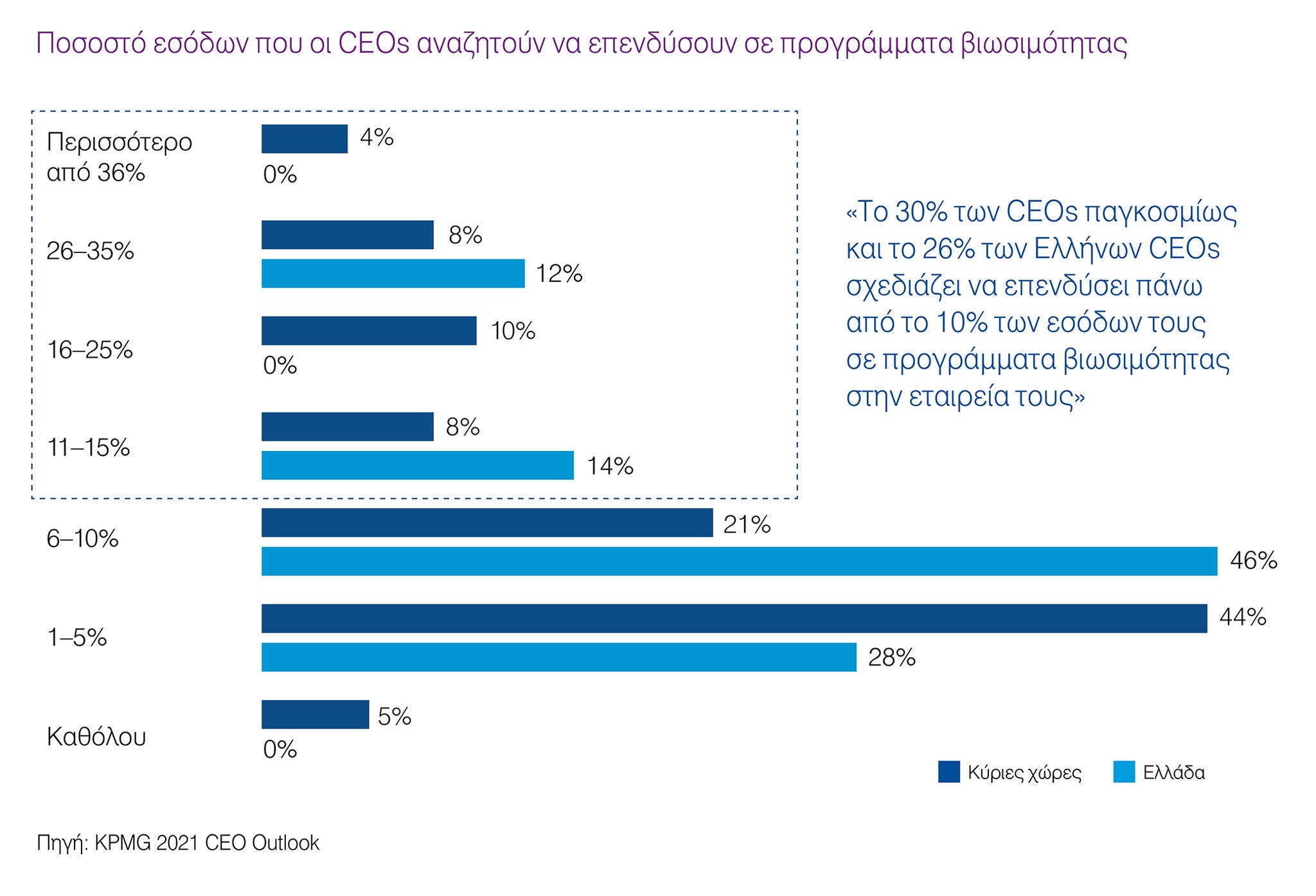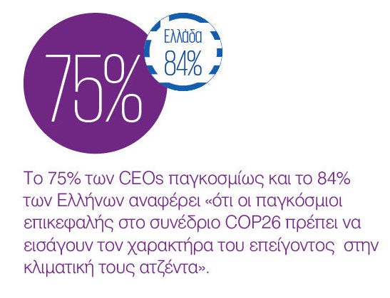 Η επίτευξη προόδου όσον αφορά την αντιμετώπιση ζητημάτων βιωσιμότητας, συμπεριλαμβανομένης της κλιματικής αλλαγής και της απαλλαγής της οικονομίας από τον άνθρακα, θα απαιτήσει ισχυρή συνεργασία μεταξύ επιχειρήσεων και κυβερνήσεων. Οι CEOs θέλουν να διαθέσουν σημαντικό κεφάλαιο ώστε να καταστούν πιο βιώσιμες οι επιχειρήσεις τους, με το 30 % να σχεδιάζει να επενδύσει πάνω από το 10% των εσόδων τους στην προσπάθεια αυτή. Όσον αφορά τους Έλληνες CEOs, το ποσοστό αυτό ανεβαίνει στο 46%.