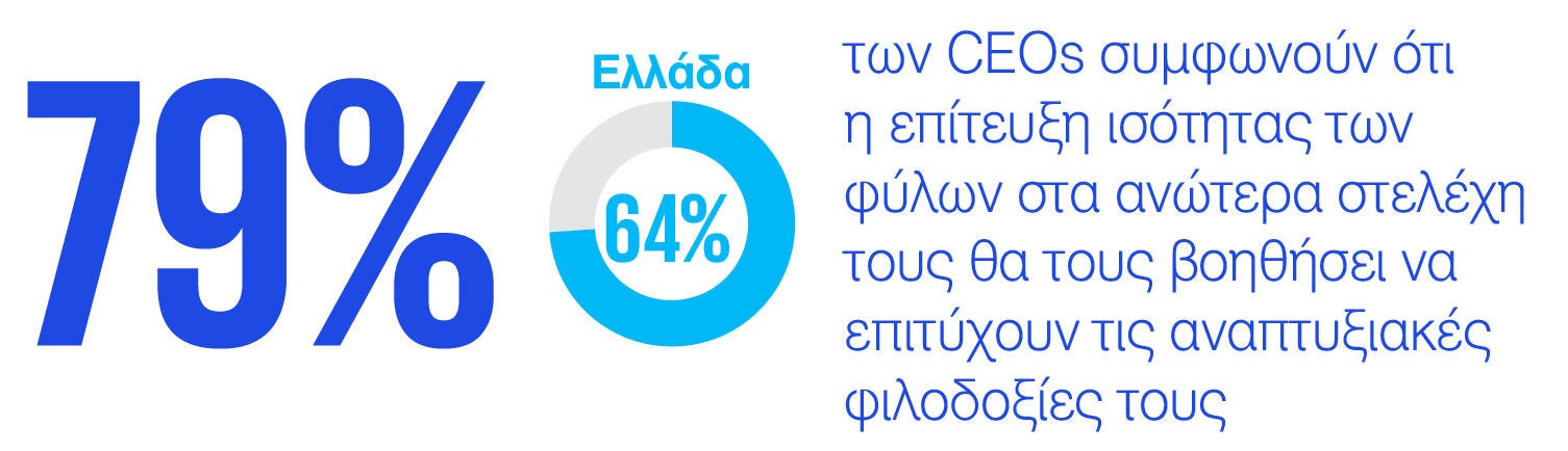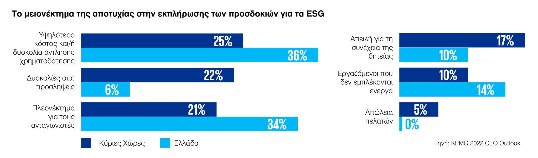 Οι CEOs συμφωνούν σε ολοένα μεγαλύτερο βαθμό ότι τα προγράμματα ESG βελτιώνουν τις οικονομικές επιδόσεις, σε ποσοστό 45% έναντι του 37% πριν ένα χρόνο. Με υψηλότερο ποσοστό για την Ελλάδα να αξιολογεί τα προγράμματα ESG ότι βελτιώνουν τις οικονομικές επιδόσεις με ποσοστό 56% έναντι του 58% από τα περσινά αποτελέσματα της έρευνας. Στην ερώτηση πού βλέπουν να επιδρά περισσότερο ο εταιρικός σκοπός τα επόμενα τρία χρόνια, η κορυφαία απάντηση των CEOs ήταν οι οικονομικές επιδόσεις με 73% σε παγκόσμιο επίπεδο και 78% για τους Έλληνες. Οι CEOs κατανοούν ότι οι επιχειρήσεις που υιοθετούν τα ESG κατορθώνουν καλύτερα να διασφαλίσουν ταλαντούχο ανθρώπινο δυναμικό, να ενισχύσουν την πρόταση αξίας των εργαζομένων και να αντλήσουν κεφάλαια. Τα ζητήματα ESG έχουν αναβαθμιστεί από συμπληρωματικά στοιχεία σε αναπόσπαστο κομμάτι της μακροπρόθεσμης οικονομικής επιτυχίας.