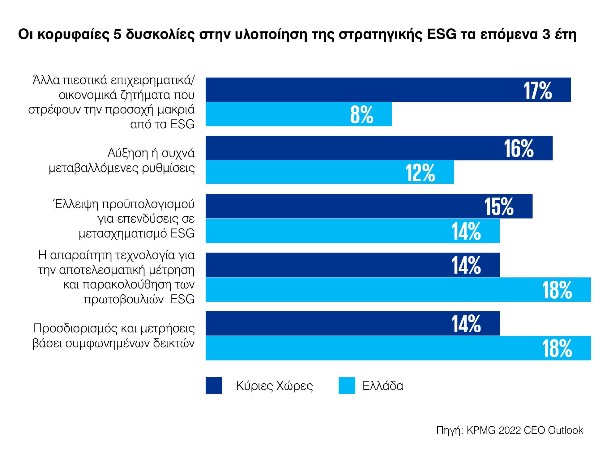 Οι συνεχώς μεταβαλλόμενες ρυθμιστικές εξελίξεις και άλλα πιεστικά παγκόσμια οικονομικά ζητήματα είναι οι μεγαλύτερες δυσκολίες που αντιμετωπίζουν οι CEOs στην υλοποίηση των στρατηγικών τους για τα ESG. Οι CEOs έχουν επίσης μεγαλύτερη επίγνωση της έλλειψης ενός αποδεκτού παγκόσμιου πλαισίου για τη μέτρηση και γνωστοποίηση των επιδόσεων στα ESG (με ποσοστό 14% να συμφωνούν οι CEOs παγκοσμίως και οι Έλληνες CEOs, σημειώνοντας άνοδο από το 7% του Αυγούστου του 2021). Οι ανησυχίες σχετικά με τις ρυθμιστικές αλλαγές παραμένουν υψηλές, κάτι που μπορεί να υποδεικνύει ότι οι παγκόσμιες κυβερνήσεις και οι ρυθμιστικές αρχές πρέπει να συνεργαστούν προκειμένου να ευθυγραμμιστούν σε σχέση με τις απαιτήσεις των ESG.