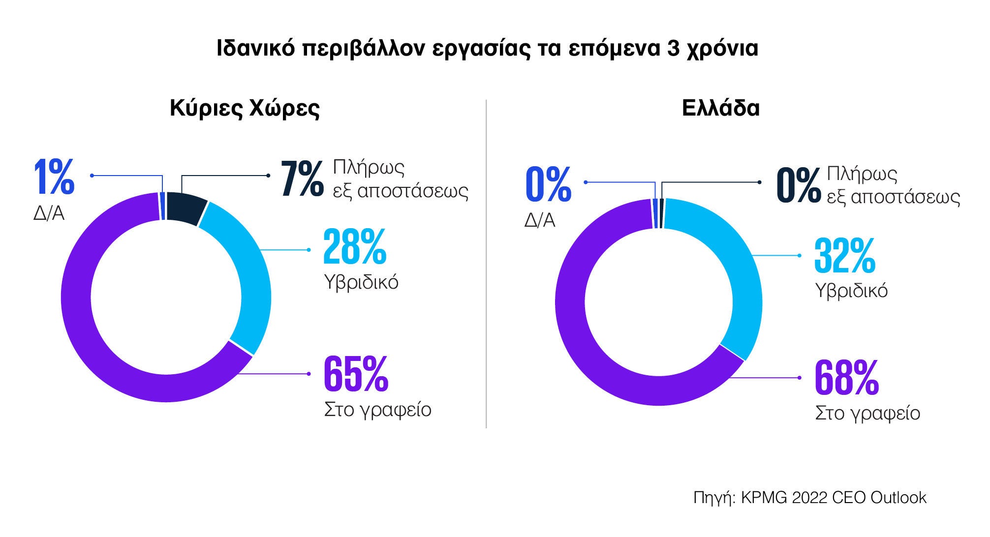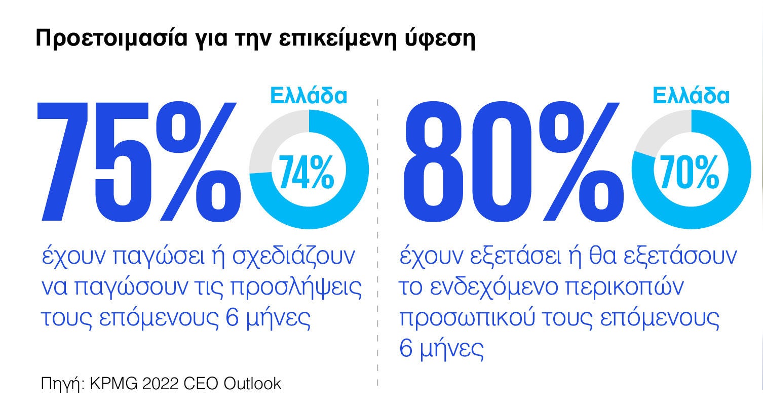 Ο τρόπος με τον οποίο οι CEOs υποστηρίζουν και προσελκύουν τα στελέχη τους μεταβάλλεται στο πλαίσιο των αναταράξεων της παγκόσμιας οικονομίας και των στόχων τους για ανάπτυξη. Η πρόταση αξίας σε σχέση με τους εργαζομένους για τη προσέλκυση και διατήρηση του απαραίτητου ταλαντούχου ανθρώπινου δυναμικού ισοβαθμεί ως η κορυφαία λειτουργική προτεραιότητα μαζί με την επίτευξη των αναπτυξιακών στόχων για την τριετία (25% από 19% το 2021). Αντίστοιχα, το 22% των Ελλήνων CEOs (από 14% το 2021) προτεραιότητα τους είναι η προσέλκυση και διατήρηση του ανθρώπινου δυναμικού. Επίσης, τα δύο τρίτα των CEOs (71%) σε παγκόσμιο επίπεδο και στην Ελλάδα (78%) συμφωνούν ότι η ικανότητα διατήρησης του ταλαντούχου ανθρώπινου δυναμικού με τις πιέσεις του πληθωρισμού/του αυξανόμενου κόστους ζωής τους απασχολούν ιδιαίτερα, όπως τους απασχολούν και οι μακροπρόθεσμες επιπτώσεις της πανδημίας και των γεωπολιτικών εντάσεων για τις επιχειρήσεις τους.