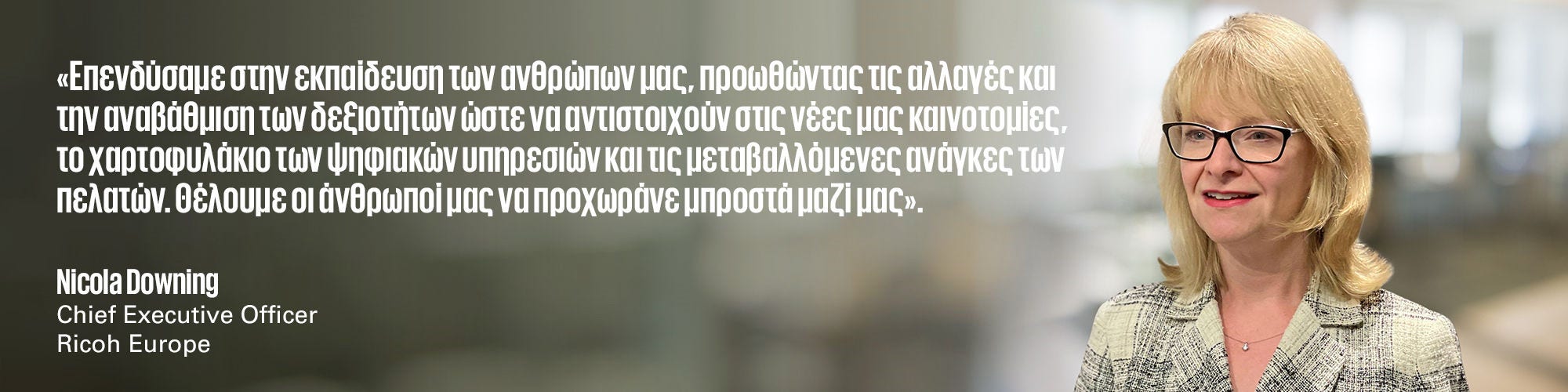 H Nicola Downing, CEO της Ricoh Europe, σχολιάζει ότι το να διαθέτεις τους κατάλληλους ανθρώπους με τις καλύτερες δεξιότητες είναι αναπόσπαστο μέρος του οράματος και της στρατηγικής της Ricoh για το μέλλον. «Είχαμε την ευκαιρία να επικεντρωθούμε πραγματικά στους εργαζομένους μας - να είμαστε πιο ανοιχτοί και ειλικρινείς σε θέματα όπως η ψυχική υγεία και η ευημερία. Επενδύσαμε στην εκπαίδευση των ανθρώπων μας, προωθώντας τις αλλαγές και την αναβάθμιση των δεξιοτήτων ώστε να αντιστοιχούν στις νέες μας καινοτομίες, το χαρτοφυλάκιο των ψηφιακών υπηρεσιών και τις μεταβαλλόμενες ανάγκες των πελατών. Θέλουμε οι άνθρωποί μας να προχωράνε μπροστά μαζί μας. Οι δεξιότητες που χρειάζεται η ομάδα μας σήμερα έχουν αλλάξει σημαντικά σε σχέση με τα αρχικά μας πλάνα. Αυτό οφείλεται στο γεγονός ότι οι προκλήσεις που αντιμετωπίζουν οι παγκόσμιες επιχειρήσεις και ο ρυθμός των αλλαγών και του μετασχηματισμού έχουν αυξηθεί απότομα».