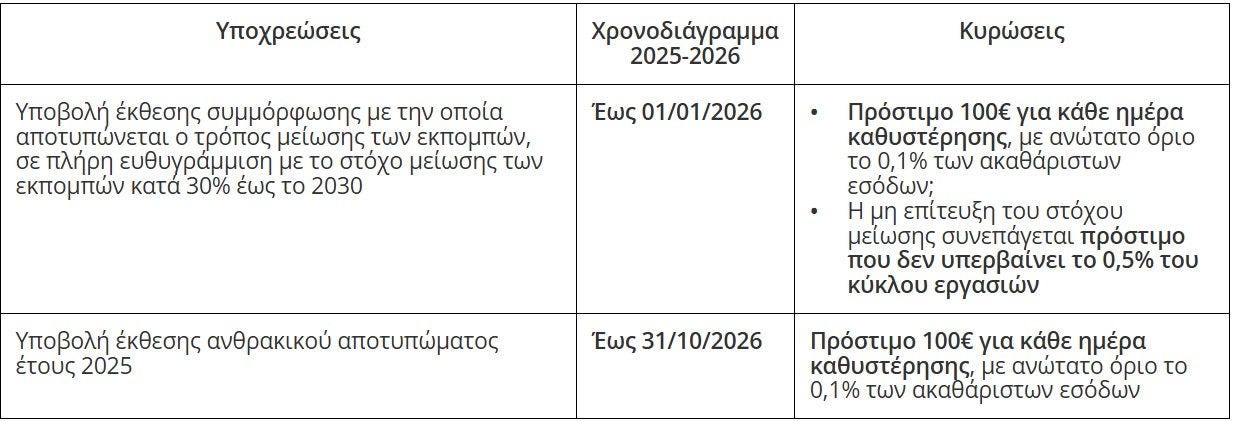 Σύμφωνα με το Άρθρο 19 του Νόμου, οι υπόχρεες Εταιρείες υποβάλλουν έκθεση για το ανθρακικό τους αποτύπωμα έως τις 31 Οκτωβρίου 2026 και αντίστοιχα για κάθε επερχόμενο έτος.