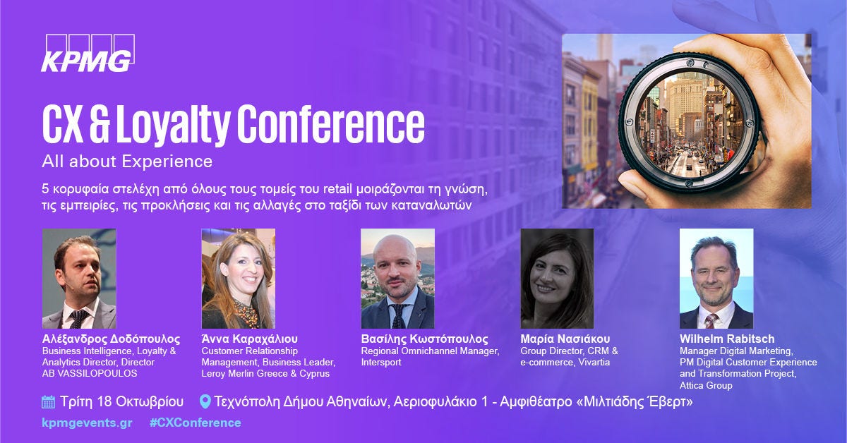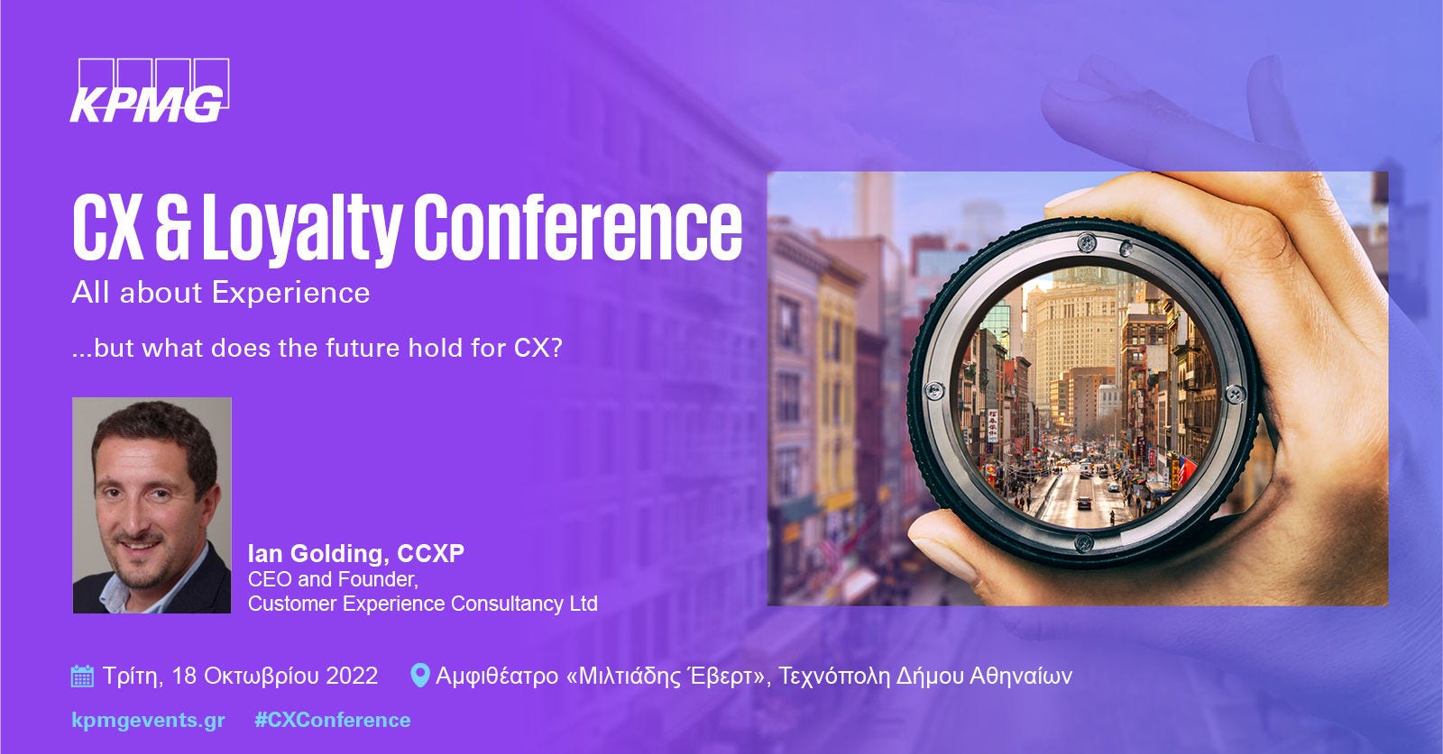 Το CX & Loyalty Conference της KPMG στην Ελλάδα θα πραγματοποιηθεί την Τρίτη 18 Οκτωβρίου στην Τεχνόπολη Δήμου Αθηναίων με κεντρικό μήνυμα “All about Experience”. Το συνέδριο θα φέρει σε επαφή top στελέχη και thought leaders από κορυφαίους οργανισμούς για να συζητήσουν και να αναδείξουν τη διαρκώς αυξανόμενη σημασία του Customer Experience για τους οργανισμούς, παρουσιάζοντας τις παγκόσμιες τάσεις, καινοτομίες και νέες ιδέες, καθώς και τις στρατηγικές ευκαιρίες που θα οδηγήσουν τις επιχειρήσεις στην κερδοφόρα ανάπτυξη και την επιτυχία.