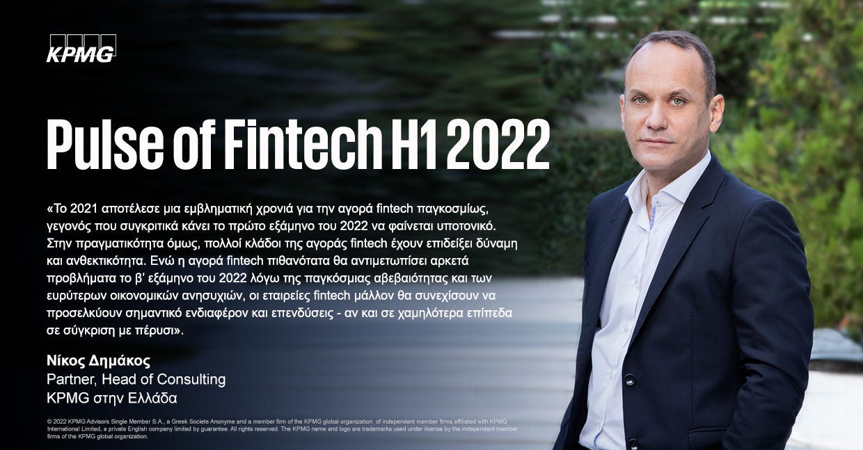 Κατά το α’ εξάμηνο του 2022 η ευρύτερη επενδυτική αγορά επηρεάστηκε από μια σειρά από προκλήσεις, συμπεριλαμβανομένης της γεωπολιτικής αβεβαιότητας, της μεταβλητότητας στις δημόσιες αγορές και της αύξησης του πληθωρισμού και των επιτοκίων. Χωρίς να φαίνεται κάποιο φως στον ορίζοντα για αυτά τα θέματα, η αγορά fintech θα μπορούσε να δει τη δραστηριότητα να επιβραδύνεται σημαντικά - ιδιαίτερα σε σύγκριση με τα μεγάλα υψηλά που καταγράφηκαν το 2021. Ενώ οι επενδύσεις fintech αναμένεται να παραμείνουν σχετικά ανθεκτικές - ιδιαίτερα σε τομείς όπως οι πληρωμές B2B, η αυτοματοποίηση της κυβερνοασφάλειας και η ανάλυση βάσει δεδομένων - η ολοκλήρωση των συμφωνιών ίσως αργήσει περισσότερο καθώς οι επενδυτές αντιμετωπίζουν τις ευκαιρίες με πιο κριτική διάθεση.