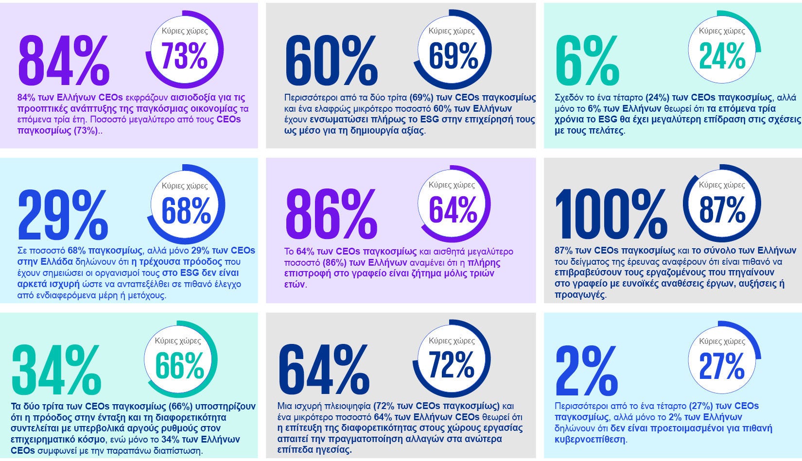 - 60% των Ελλήνων CEOs έχουν ενσωματώσει πλήρως το ESG στην επιχείρησή τους ως μέσο για τη δημιουργία αξίας.