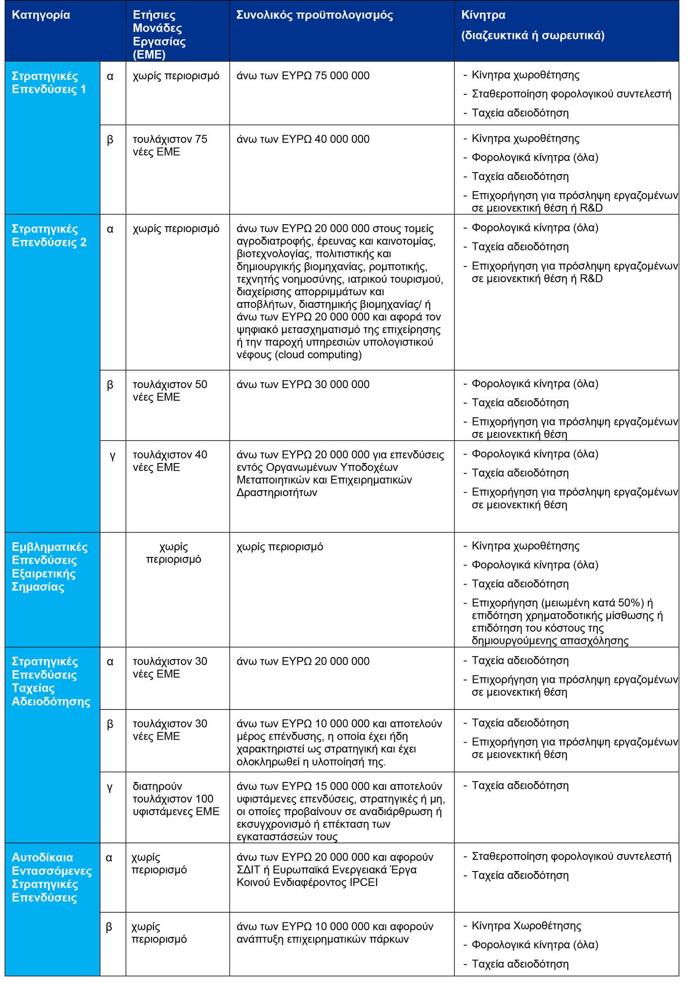 Οι στρατηγικές επενδύσεις διακρίνονται ανάλογα με τα παρεχόμενα κίνητρα στις ακόλουθες κατηγορίες: «Στρατηγικές Επενδύσεις 1», «Στρατηγικές Επενδύσεις 2», «Εμβληματικές Επενδύσεις Εξαιρετικής Σημασίας», «Στρατηγικές Επενδύσεις Ταχείας Αδειοδότησης», «Αυτοδίκαια εντασσόμενες Στρατηγικές Επενδύσεις».