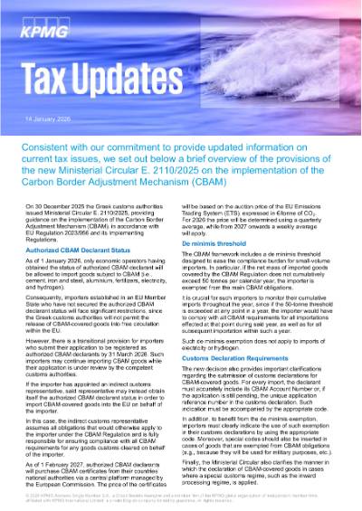 Consistent with our commitment to provide updated information on current tax issues, we set out below a brief overview of the provisions of the new Ministerial Circular E. 2110/2025 on the implementation of the Carbon Border Adjustment Mechanism (CBAM).
