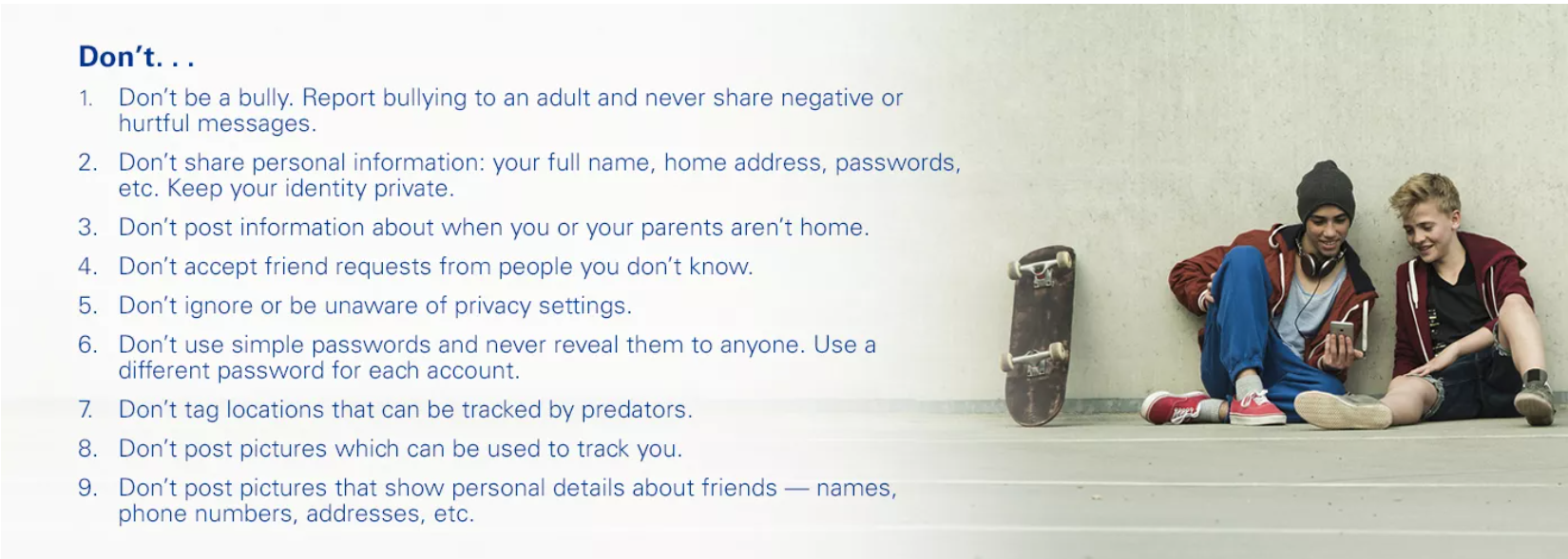 Young people are using a growing array of social media platforms every day, which makes it important to follow best practices that foster smart habits for safe and productive online interactions. It’s crucial for parents, guardians, teachers and students to stay informed and proactive on both the benefits and potential threats that social media activity presents today. Protecting kids and teens from trolls, cyberbullies, ‘fake’ friends and online scams requires parents to be involved daily to help ensure privacy, security and positive social media activity. Here’s a brief guide for success on social media!
