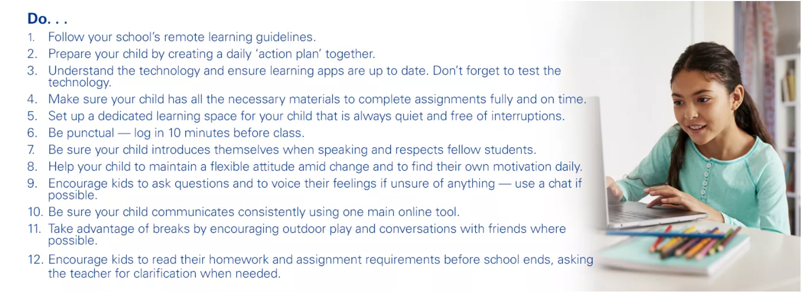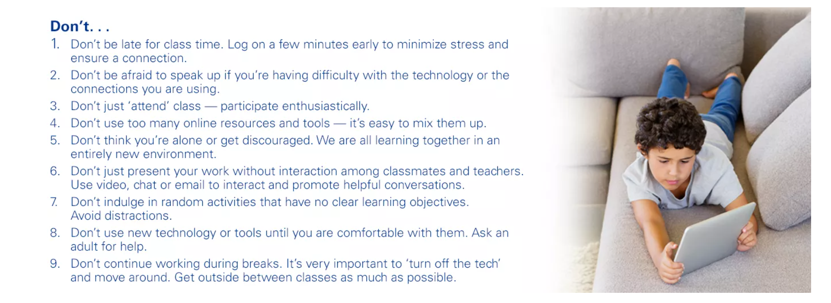 As you can see, clear and consistent communication is a key to making remote learning work for kids in the ‘virtual learning’ environment. Beyond knowing what to do to promote successful learning every day, here are some tips on what you can avoid so to help keep kids engaged, focused and happy. Be sure to share this list with your kids and discuss the importance of maintaining an enthusiastic approach to learning at a distance.