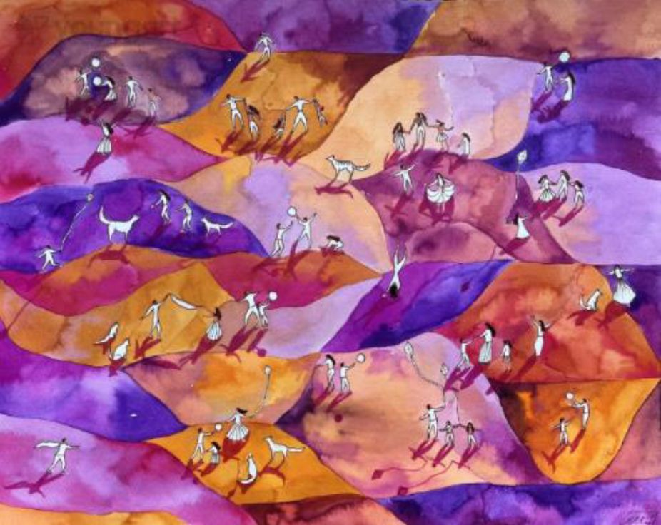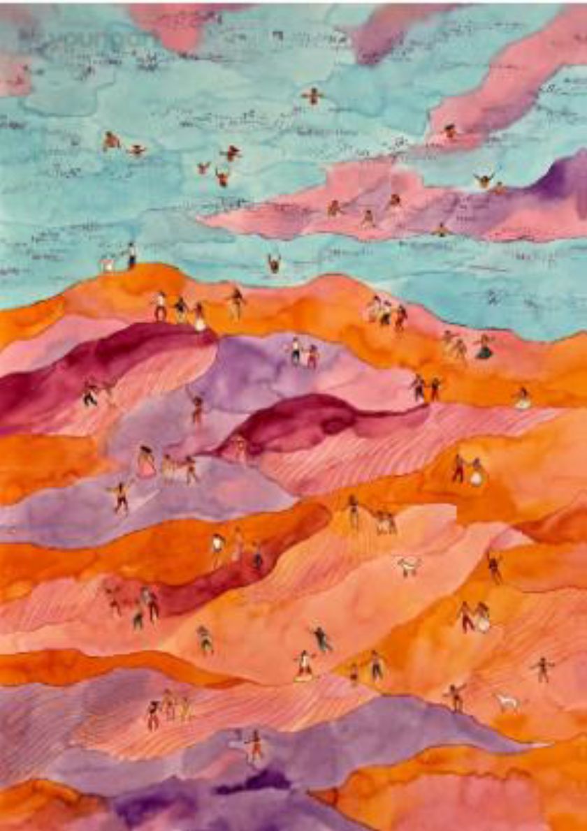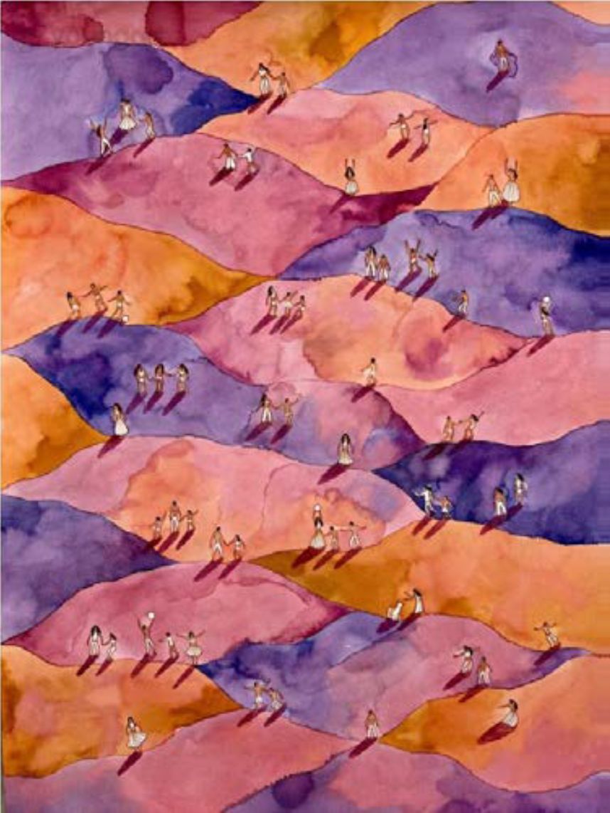 In my work, I explore the shared, eternal rhythm between the natural landscape and human presence. The inhabitants of my paintings - miniature figures arranged in playful formations - embody both the lightness and the solemnity of existence. They swim, dance, and wander, moving in harmony with the colorful rolling hills, the wind-rippled water surfaces, or the clouds of imagination. On the surface, these may appear as ordinary scenes - summer bathing, walks, moments of togetherness - but these simple gestures often become metaphors for inner freedom, belonging, and the experience of happiness. My palette is intuitive yet deliberate: the translucent layers of watercolor and the depth of oil paints evoke the dreamlike beauty of the world. In my compositions, the landscape does not aim for geographical accuracy but rather reflects memories and emotional terrains. Every form follows soft curves, as if it too were part of the movement. The horizon dissolves - there is no above or below, only flow - between colors, people, and experiences. My goal is to invite the viewer to step into this world, even for a moment: to be on the shore among the parasols, in the field with friends, or floating on the water’s surface, where everything is quiet and timeless. These small stories together outline a greater harmony - a return to the childlike perception of joy, where every moment is both play and presence.
