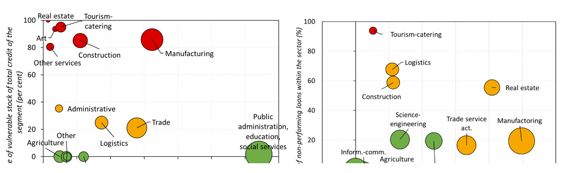 Risk indicators for corporate lending also improved fundamentally by the end of 2019, the share of project loans in the sector-level portfolio decreased compared to the previous crisis, but companies are also experiencing significant difficulties with the coronavirus epidemic and negative supply and demand shocks. Debt service can be a problem for companies that lose a significant portion of their revenue. In the figure above, vulnerable loans are the loans taken out by debtors with vulnerable activities (Hungarian NACE Rev. 2), the size of the circle bubble is proportional to the value added of the sector as a whole. In addition to the above, based on the MNB's data, it can be seen that 16% of the current bank corporate loan portfolios have a medium or worse liquidity situation and at the same time, a medium or high level of indebtedness.