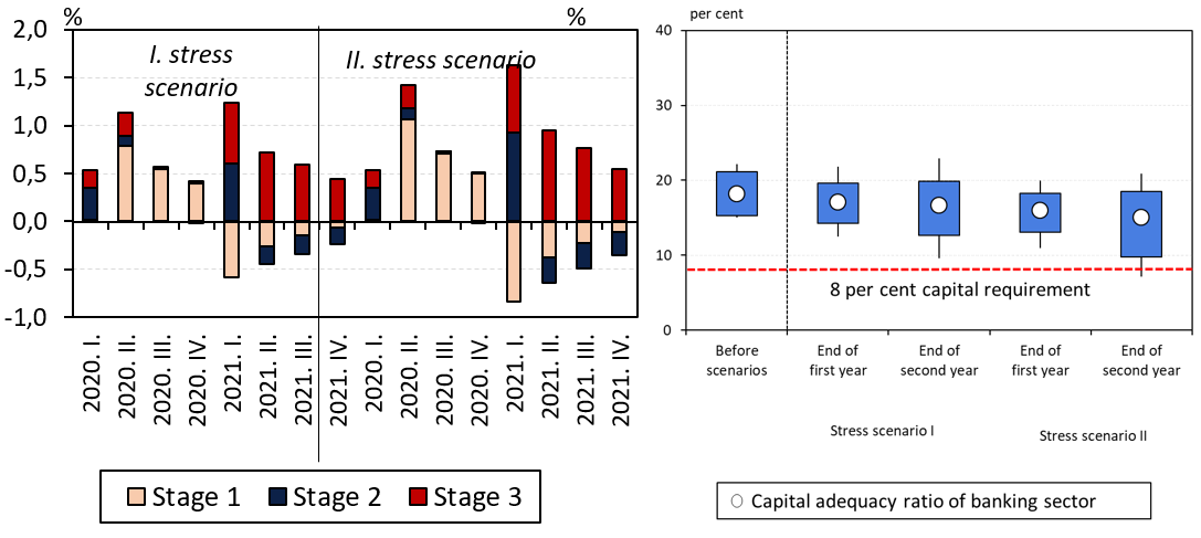 The other figure shows what the impact would be on capital adequacy for a given stress situation. Based on the MNB's results calculated on the basis of current information, it can be seen that although the epidemic will have a significant impact on the profitability of the banking system, most domestic banks do not need capital replenishment even in the event of a more severe stress trajectory.