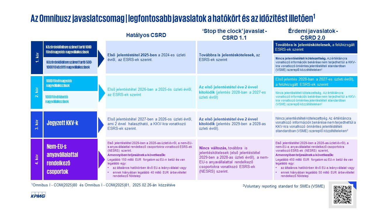 Az Európai Bizottság február 26-án nyilvánosságra hozott két irányelv-módosítási javaslata[1] gyakorlatilag két lépcsőben módosítaná a CSRD szerinti jelentéstétel jelenlegi időbeli ütemezését és hatókörét. Az első javaslat (CSRD 1.1 – „Stop the clock”) értelmében a jelentéstétel második és harmadik körében érintett vállalkozások (azaz a 250-500 fő közötti közérdeklődésre számot tartó, valamint a 250 fő feletti nem közérdeklődésre számot tartó nagyvállalkozások, illetve a jegyzett KKV-k) számára két évvel kitolódna a jelentéstétel kezdete: a 2025-ben megkezdett üzleti év helyett első ízben a 2027-ben megkezdett üzleti évről 2028-ban, míg a 2026-ban megkezdett üzleti év helyett első ízben a 2028-ban megkezdett üzleti évről 2029-ben kellene elkészíteni az ESRS-ek szerinti közzétételeket. A Bizottság ezen javaslat gyorsított tárgyalását javasolja a Tanácsnak és a Parlamentnek, így szándékaik szerint 2025. végéig megszületne az uniós döntés, valamint megtörténne az ezzel kapcsolatos tagállami jogszabályok módosítása is. Tekintettel arra, hogy a CSRD helyi jogrendbe való átültetése Európa-szerte jelenleg is országonként nagyon eltérő képet mutat, várhatóan eltérő lesz a módosítási javaslat fogadtatása és helyi implementációjának időigénye is az egyes tagállamokban, ami még tovább növelheti a bizonytalanságot a felkészülés előtt álló vagy azt már megkezdett vállalkozásoknál.