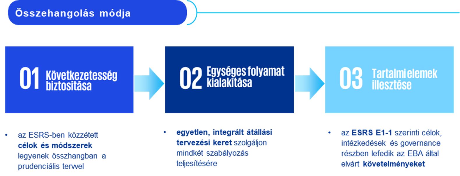 Az EBA ezért egyértelműen integrált, egységes tervezési folyamat kialakítását javasolja, amely egyszerre felel meg a prudenciális és a fenntarthatósági jelentéstételi követelményeknek.