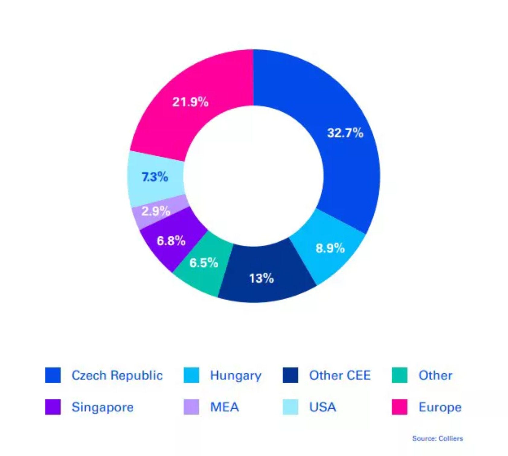 A cseh befektetői jelenlét dominálta a régió befektetői piacát is, az összes befektetés csaknem egyharmadát tette ki (32,7 százalék). Ebben a tekintetben egyébként Magyarország is felülteljesít, hiszen az összes Közép-Kelet Európában történt ingatlanbefektetés 8,9 százalékát hazai befektetők hajtották végre. A többi vizsgált régióbeli ország összesen 13 százalékkal vette ki részét a régióba irányuló befektetésekből, míg az amerikai, szingapúri, közel-keleti, illetve egyéb országok befektetéseinek aránya 45,4 százalék volt.