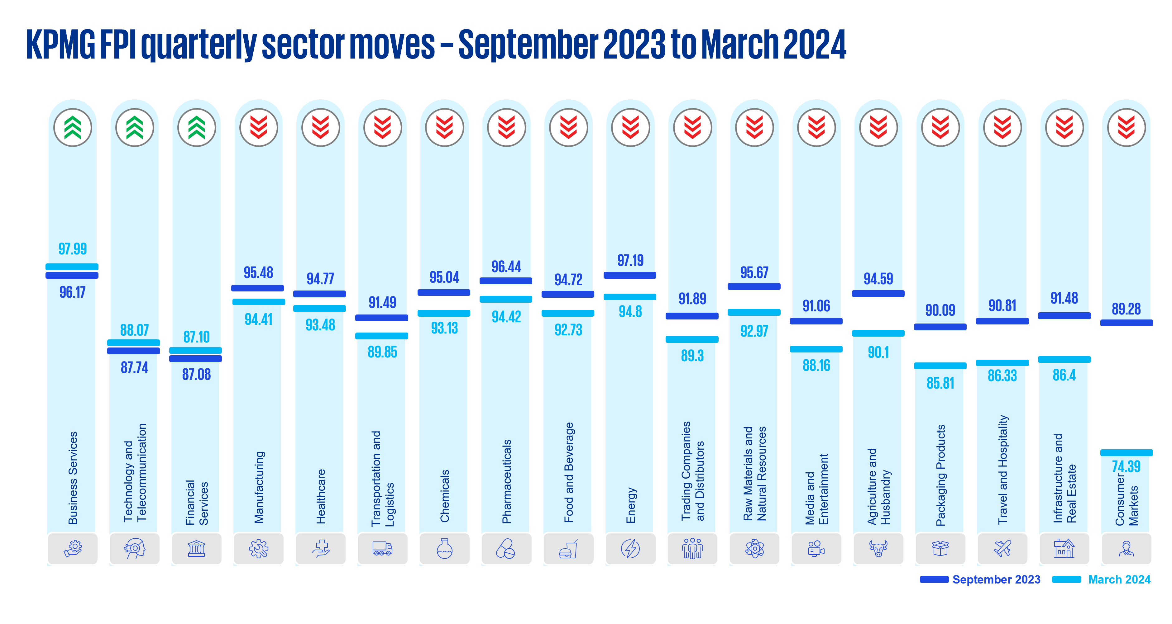 Between October 2023 and March 2024, we observed a decrease in the Indonesian KPMG FPI from 90.26 to 87.31. This denotes increased turbulence in the financial corporate health of companies headquartered in Indonesia. Only three among all 21 sectors analyzed, have shown an increase in the KPMG FPI score.