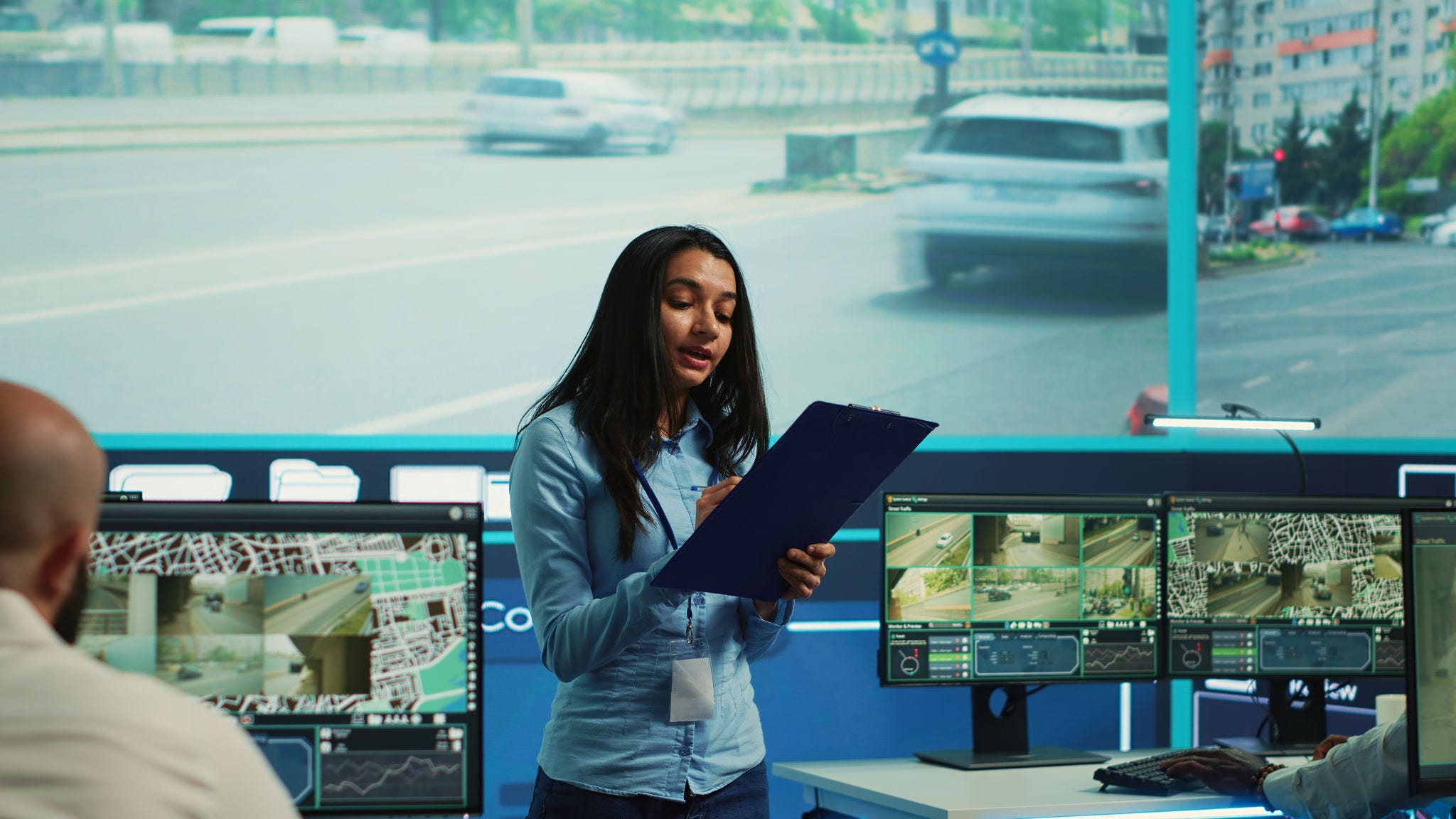 Indian supervisor leads her team to monitor the surveillance video footage and CCTV cameras to learn about urban traffic dynamics. Diverse people working on public safety. Camera A.