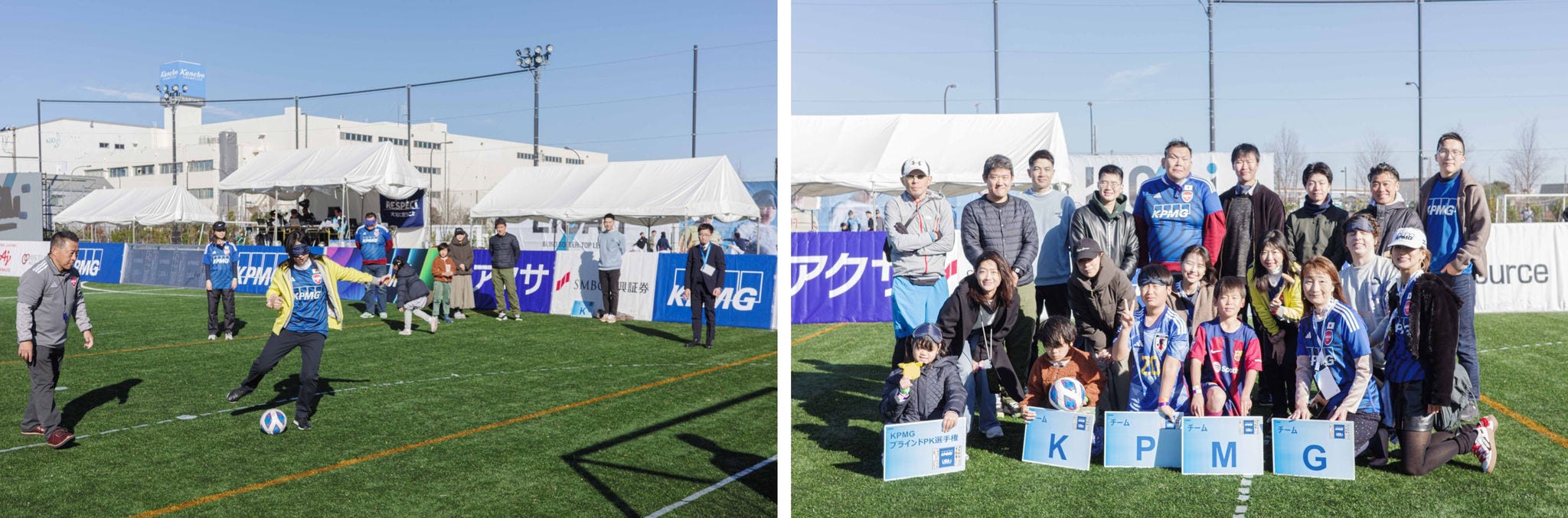 また、KPMGジャパンのIDE(Inclusion, Diversity and Equity)の醸成を目的に、大会当日の、第1試合と第2試合の間に、メインピッチでブラインドPK戦を開催し、KPMGジャパンの職員と家族がブラインドサッカーを通じたコミュニケーションワークを体験しました。