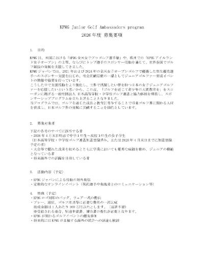 こうした中で支援活動をより強化し、世界を目指す日本の女子ジュニアゴルファーを応援したいという思いから、この度、「ゴルフを通じて青少年の人間教育を」をスローガンに掲げる一般社団法人 日本高等学校・中学校ゴルフ連盟と協力し、新たなスポンサーシッププログラム「KPMG Junior Golf Ambassadors program」を立ち上げます。