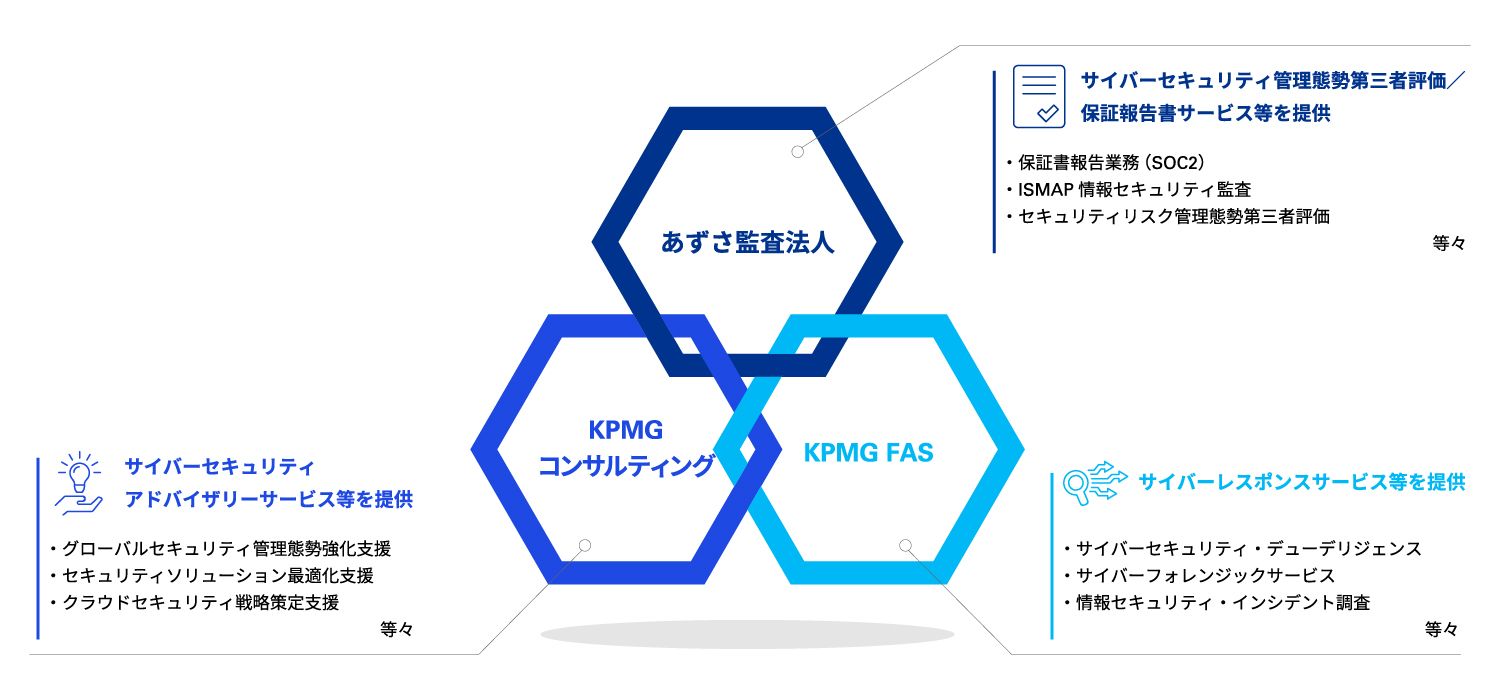 あずさ監査法人は、サイバーセキュリティ管理態勢第三者評価サービスやISMAP情報セキュリティ監査サービスを、KPMGコンサルティングは、サイバーセキュリティの戦略策定、トランスフォーメーションを支援するサービスを、KPMG FASは、デジタルフォレンジックを中心にサービス提供しています。